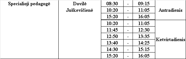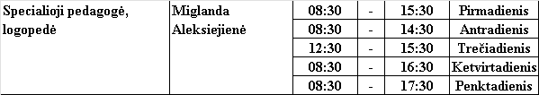 Specialioji pedagogė ir logopedė rūpinasi sėkminga specialiųjų poreikių turinčių mokinių integracija mokykloje, bendradarbiauja su specialiųjų poreikių vaiko tėvais (globėjais), konsultuoja juos. Atlieka pedagoginį mokinių vertinimą (nustato jų žinių, mokėjimų, įgūdžių, gebėjimų lygį ir jų atitikimą ugdymo programoms) bei vertina pažangą mokykloje. Veda pamokas, kurių metu padeda šiems mokiniams įsisavinti ugdymo turinį bei lavina jų sutrikusias funkcijas, atsižvelgdamas į kiekvieno vaiko gebėjimų lygį, ugdymosi galimybes, mokymosi ypatumus. Konsultuoja mokytojus kaip individualizuoti ir/ar pritaikyti bendrąsias ugdymo programas. Rūpinasi mokinių kalbos vystymosi raidos, kalbos, kalbėjimo bei kitų komunikacijos sutrikimų korekcija. Jis atlieka mokinių tarties, žodyno, gramatikos sandaros, rišliosios kalbos tyrimą, numato kalbos ir kalbėjimo korekcijos kryptis. Darbo forma – pratybos tarties, rašymo sutrikimus, kalbos neišsivystymą turintiems mokiniams. Jis konsultuoja mokinius, o taip pat ir tėvus bei pedagogus, dirbančius su mokiniais, turinčiais įvairių kalbėjimo bei kalbos sutrikimų. Skaito pranešimus mokytojų metodiniuose būreliuose, tėvų susirinkimuose Dalyvauja gimnazijos vaiko gerovės komisijos (VGK) veikloje.