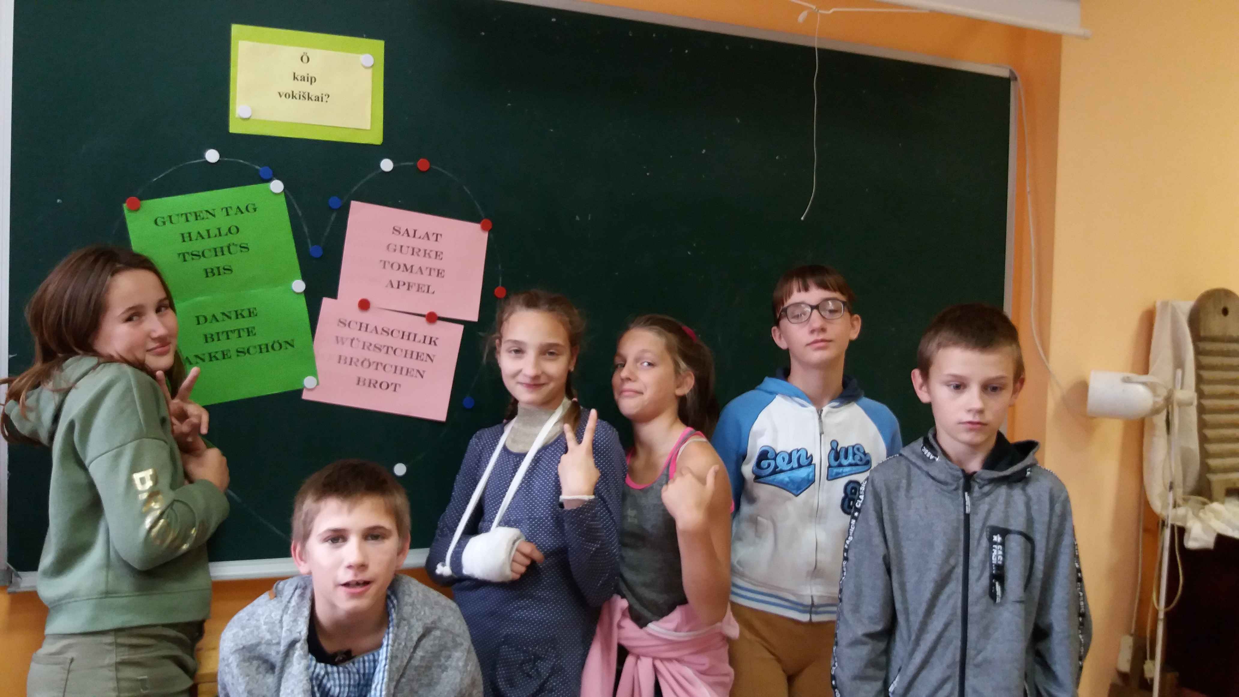 Mūsų gimnazijos mokiniams pirmoji užsienio kalba — anglų. Tačiau spalio 25 d., Vokiečių kalbos dieną, turėjau galimybę 3-6 klasių mokinius supažindinti su vokiečių kalba, su vokiškai kalbančiomis šalimis, surengti viktoriną bei išmokyti 6 klasės mokinius dainuoti gimtadienio dainą vokiškai. Smagu, kad šią dieną pavyko prisijungti prie respublikinio projekto ,,O kaip vokiškai?” , kurį inicijavo Vokietijos Federacinės Respublikos ambasada Lietuvoje, Goethe’s institutas, Centrinės užsienio švietimo sistemos valdyba (ZfA), Vokietijos akademinių mainų tarnyba (DAAD) ir Vokietijos ir Baltijos šalių prekybos rūmai (AHK). Fotonuotraukos autoriaus.