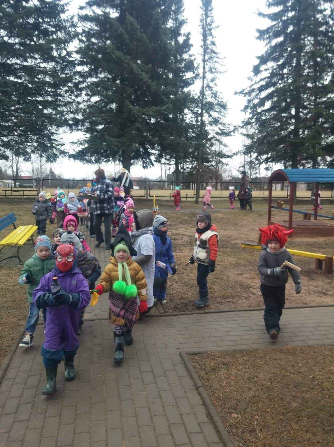 Kovo 5 d. Kamajų ikimokyklinio ugdymo skyriaus kiemelyje susirinko gausus būrys persirengėlių, nešinų tarškynėmis, barškučiais. Vaikus kieme pasitiko gražuolė Morė ir Kanapinis su Lašininiu. Paklausti, ko čia visi susirinko, vaikai atsakė norintys išvaryti žiemą. Tad barškindami, šaukdami „Žiema, žiema, bėk iš kiemo“ patraukėme ieškoti, kur pasislėpė žiema. Triukšmadarių paradas žiemą išvarė iš kiemo.