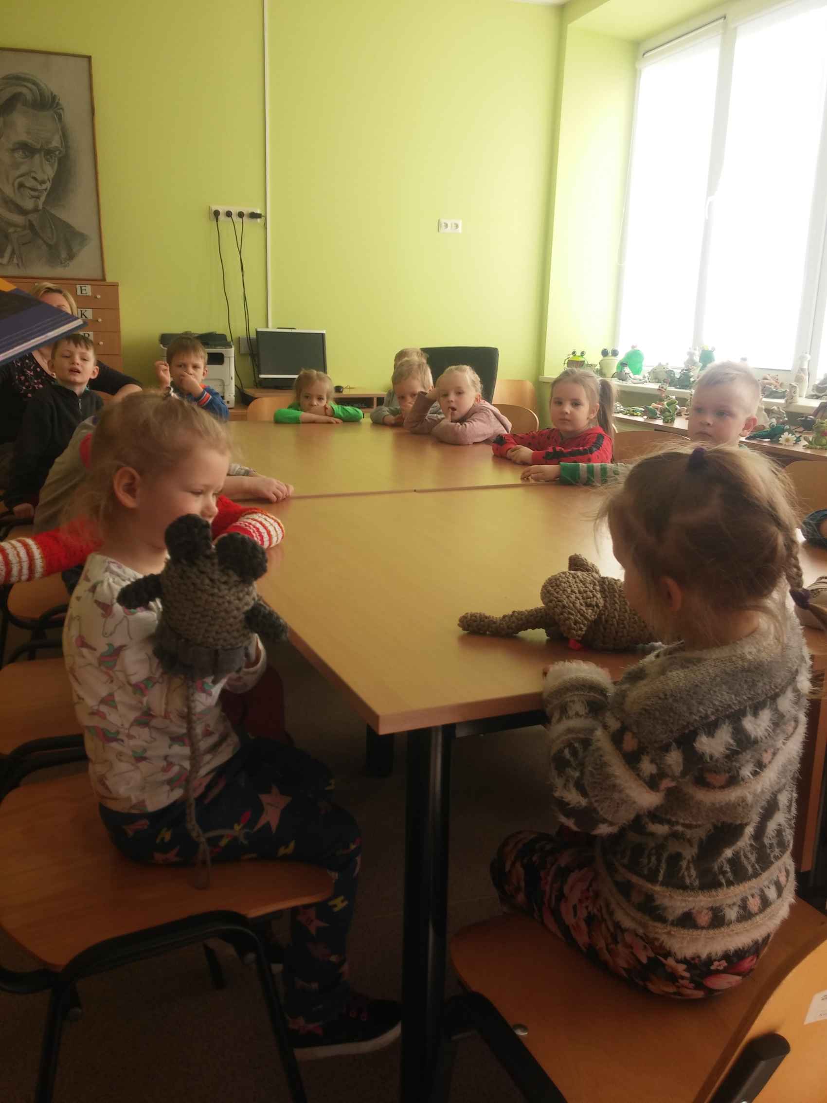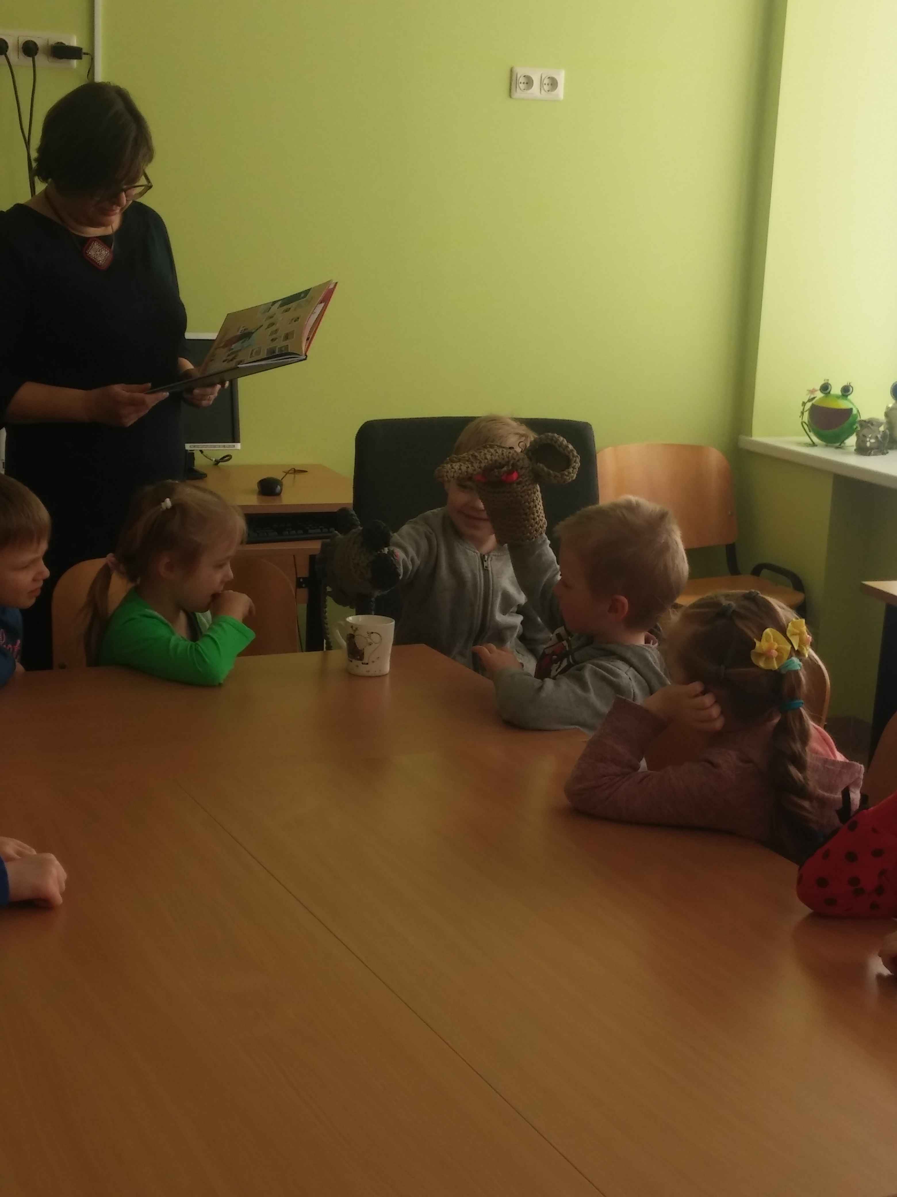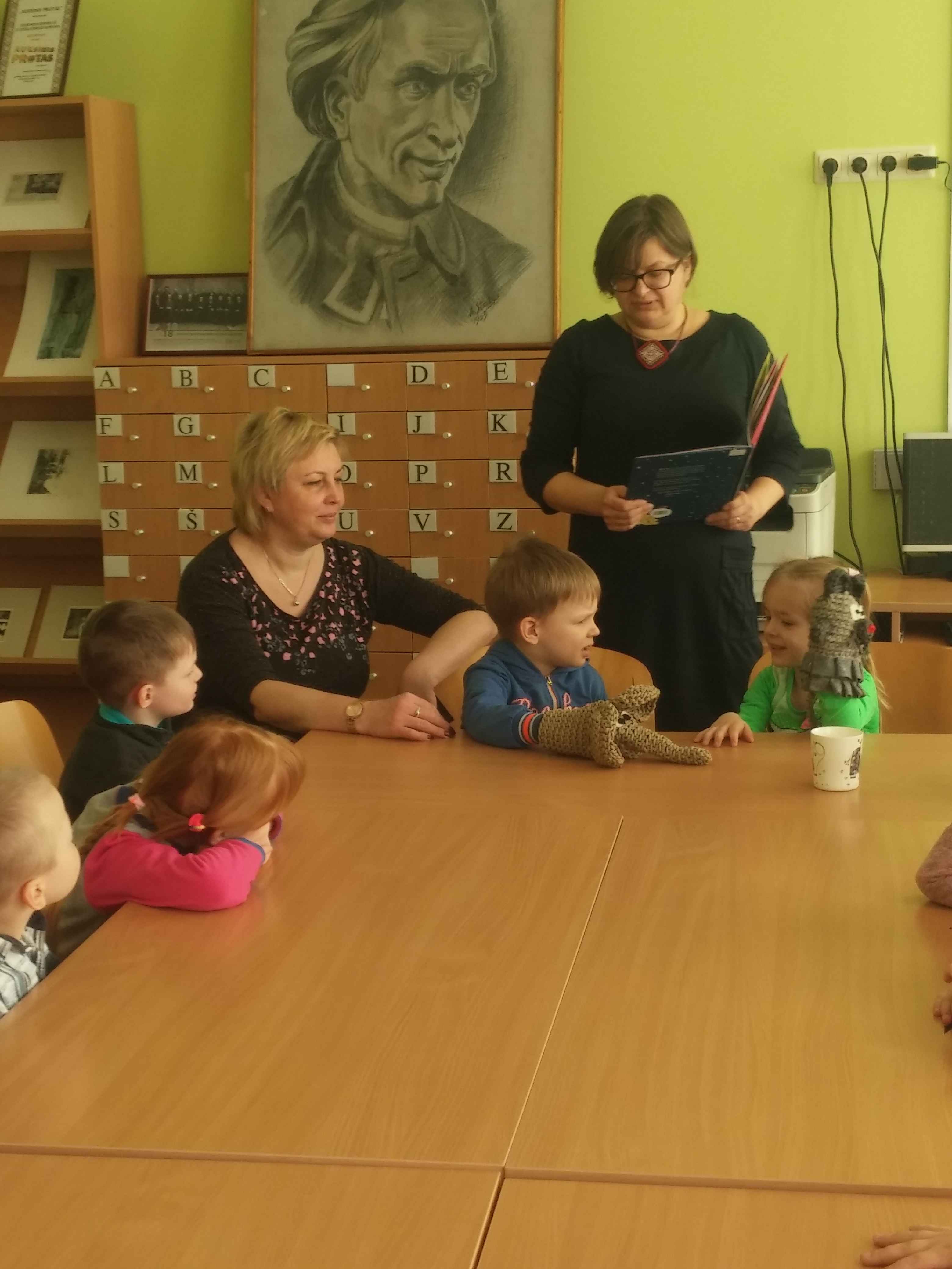 Labiausiai mažuosius svečius džiugino bibliotekos ,,gyventojos‘‘ rankinės lėlytės: pelytė ir drambliukas iš Mariaus Marcinkevičiaus ir Aušros Kiudulaitės knygutės „Draugystė ant straublio galo“. Šią istoriją bibliotekininkė Jolanta skaitė, o vaikai, keisdamiesi personažais, nuotaikingai vaidino. Po to vaikai rašė drambliuko laiškus, kuriuos skyrė savo mamytėms, sesutėms ar kitiems artimiesiems. Atsisveikinę su bibliotekininke, vaikai rūpestingai nešėsi į darželį savo laiškučius bei pasirinktas skaityti knygutes.