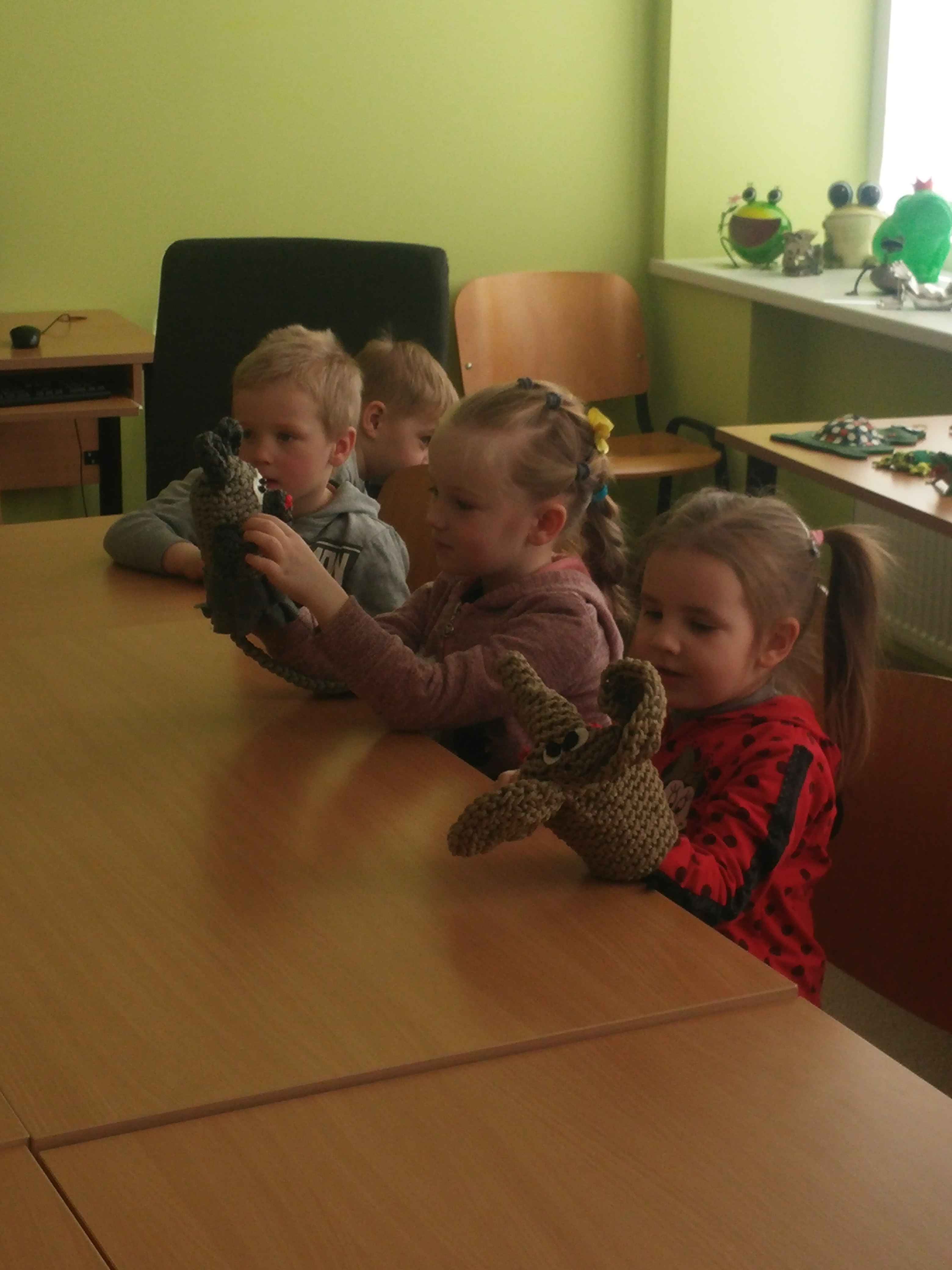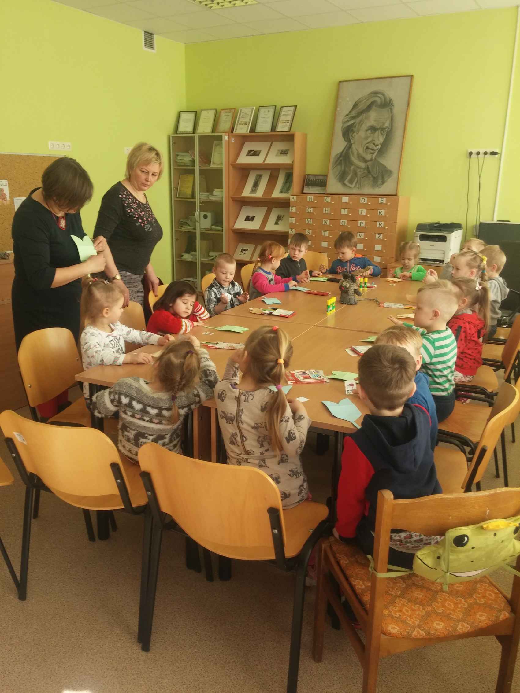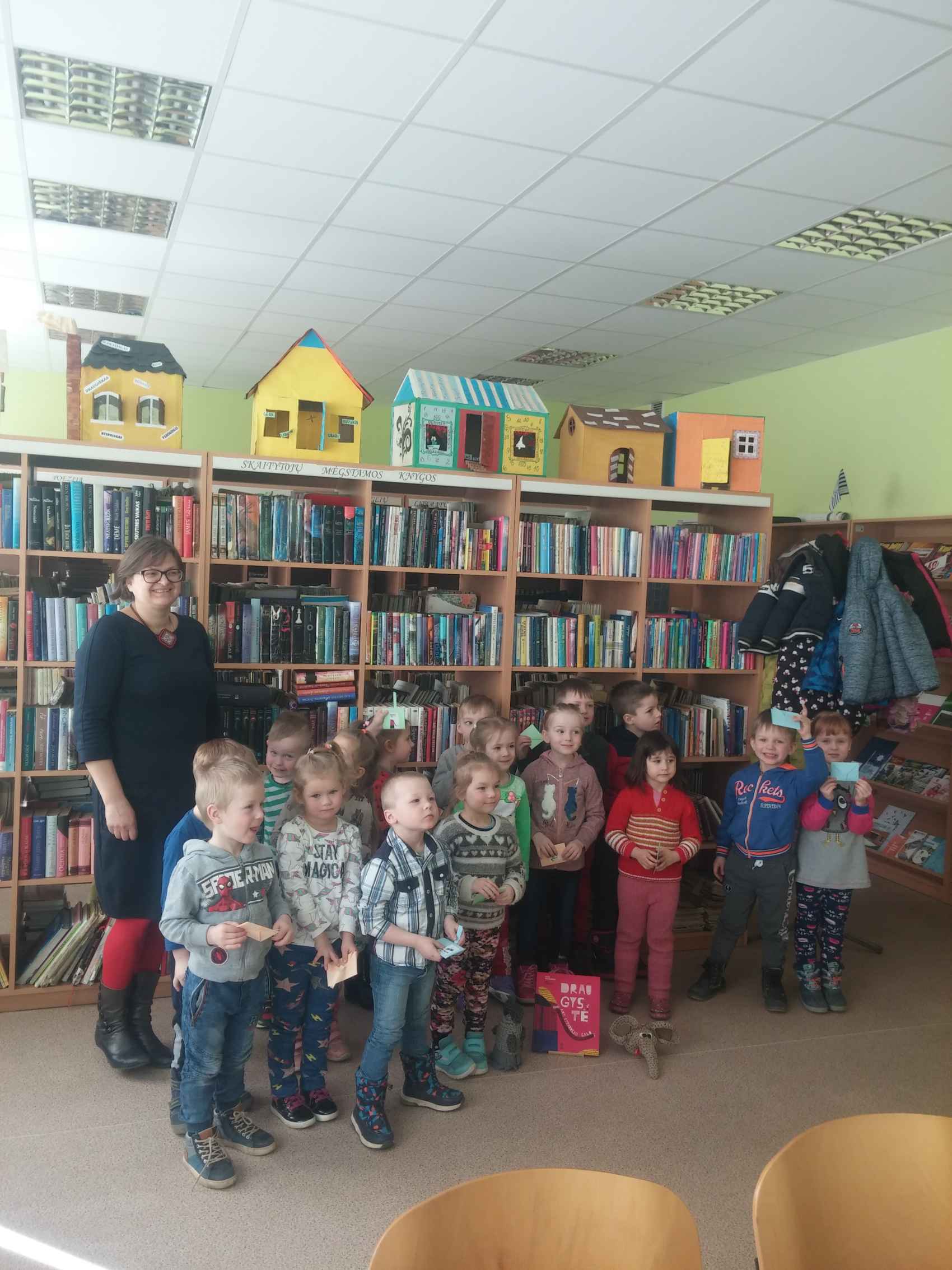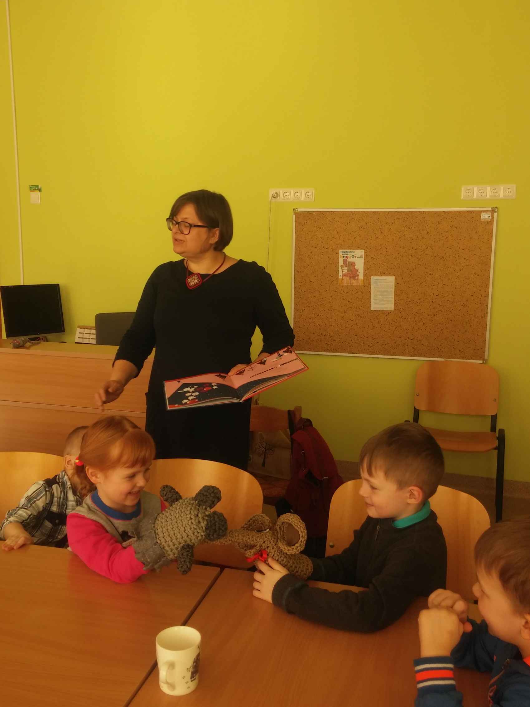 Labiausiai mažuosius svečius džiugino bibliotekos ,,gyventojos‘‘ rankinės lėlytės: pelytė ir drambliukas iš Mariaus Marcinkevičiaus ir Aušros Kiudulaitės knygutės „Draugystė ant straublio galo“. Šią istoriją bibliotekininkė Jolanta skaitė, o vaikai, keisdamiesi personažais, nuotaikingai vaidino. Po to vaikai rašė drambliuko laiškus, kuriuos skyrė savo mamytėms, sesutėms ar kitiems artimiesiems. Atsisveikinę su bibliotekininke, vaikai rūpestingai nešėsi į darželį savo laiškučius bei pasirinktas skaityti knygutes.