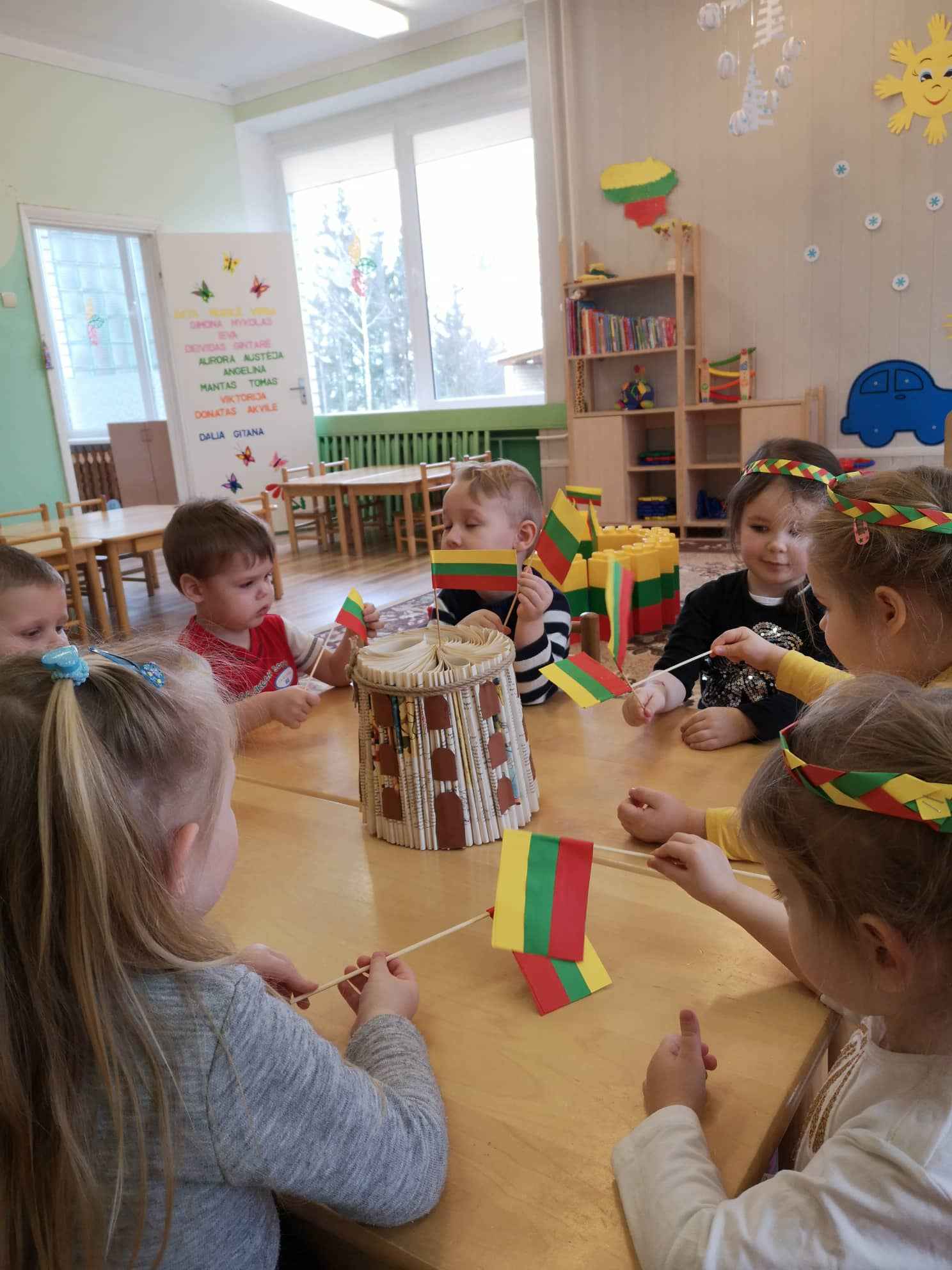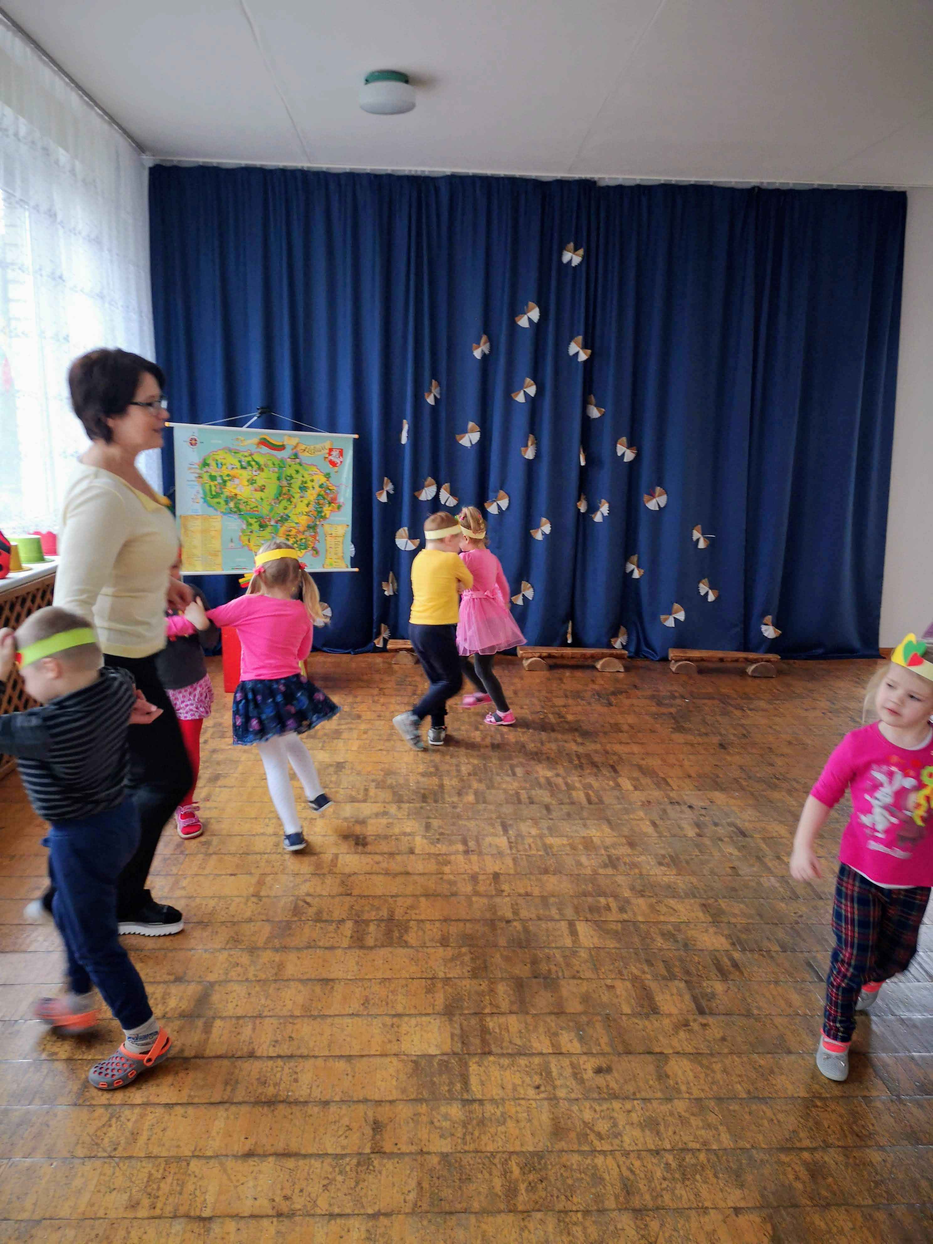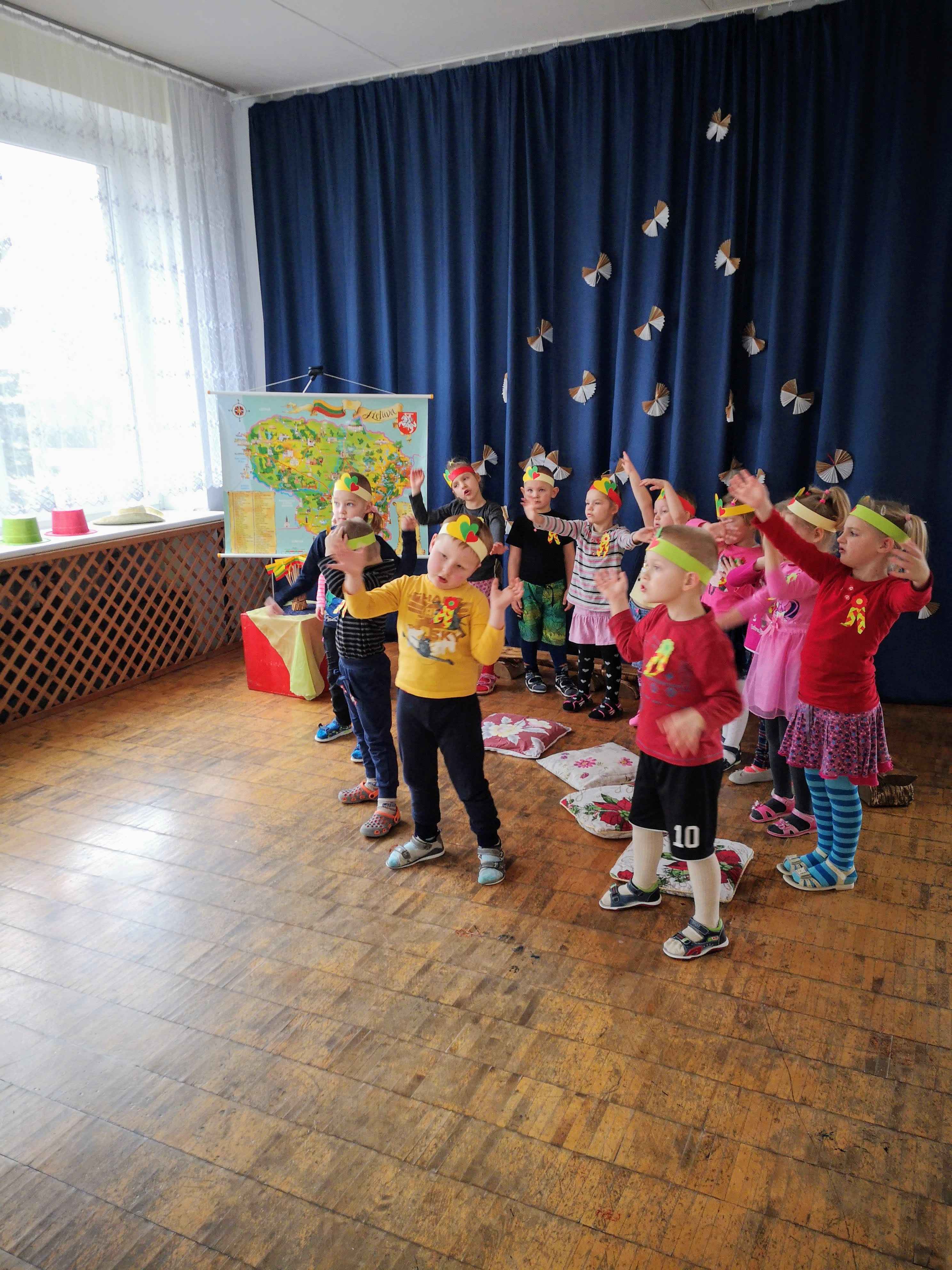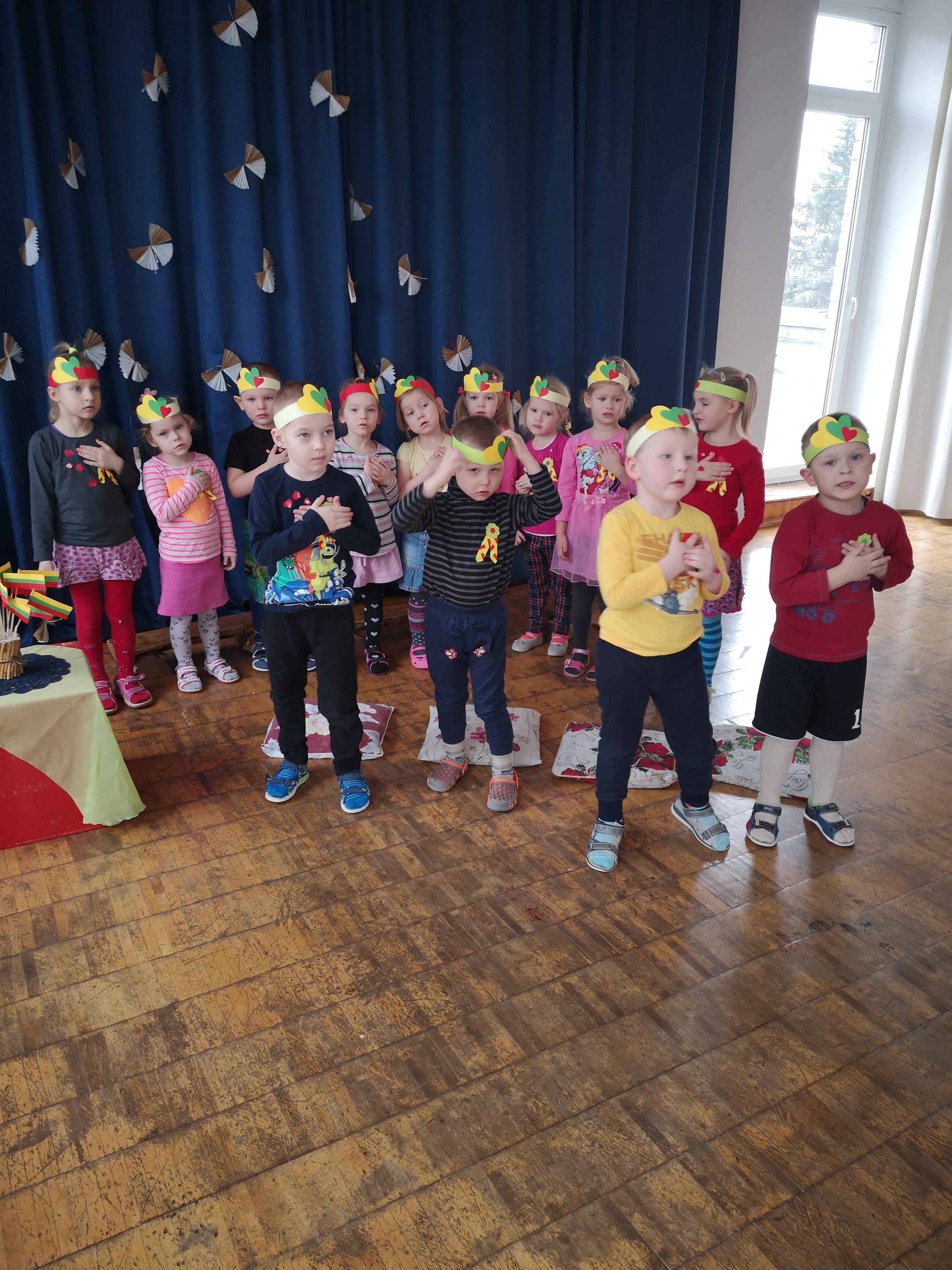 Užbaigę darbelius, pasipuošę trispalvėmis širdelių karūnomis, vaikai darželio salėje giedojo valstybės himną, dalyvavo viktorinoje „Ką aš žinau apie Lietuvą?“, atlikdami užduotis klausėsi lietuvių liaudies pasakų, šoko, žaidė žaidimus.