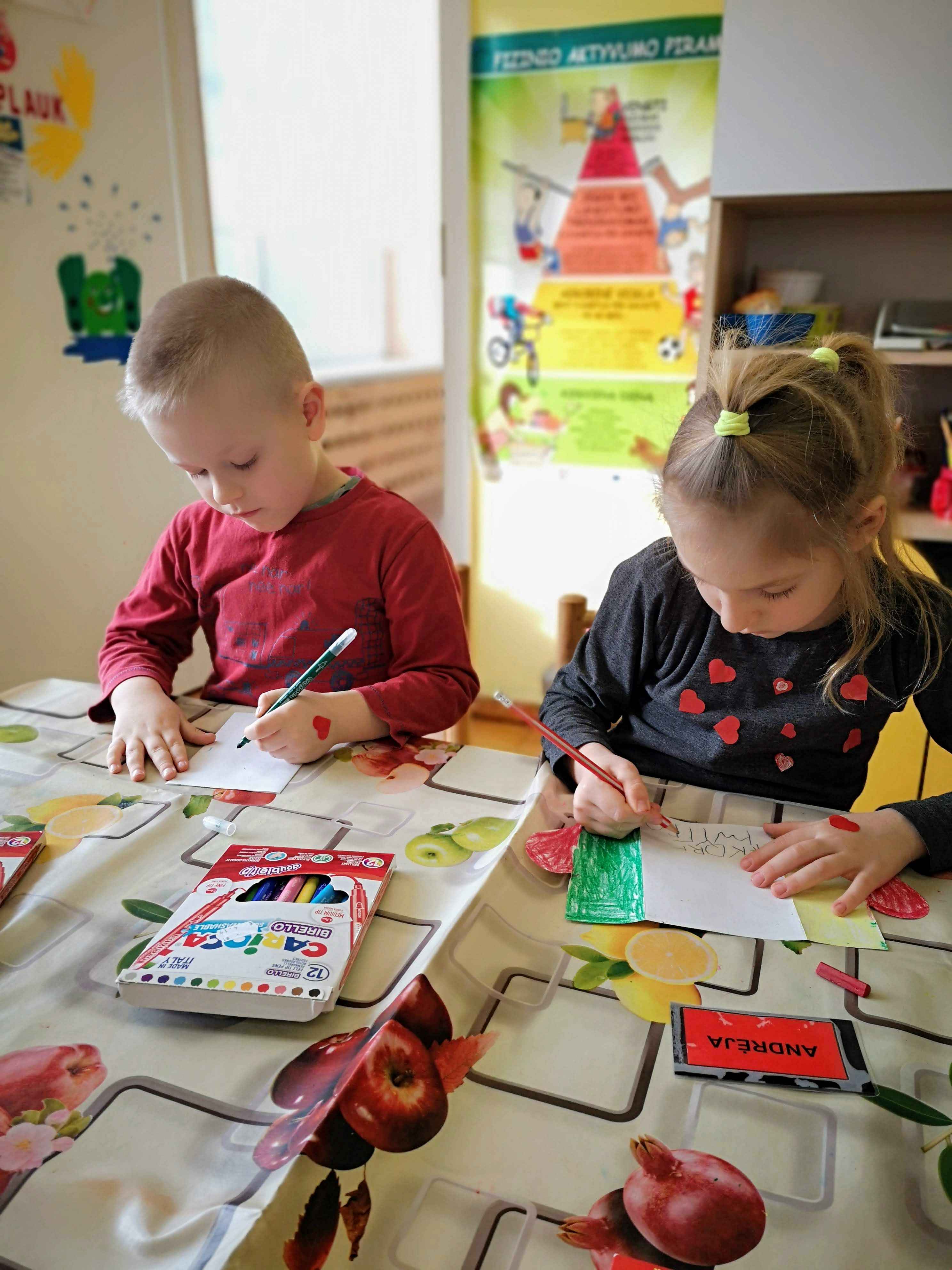 Vasario 14-ąją ikimokyklinio ugdymo skyriaus „Boružėlių“ grupės vaikai džiaugėsi dviguba švente – Lietuvos valstybės atkūrimo diena ir šv. Valentino diena. Iš ryto vaikai gamino šventinius atvirukus, kuriuose rašė sveikinimus savo šeimų nariams.