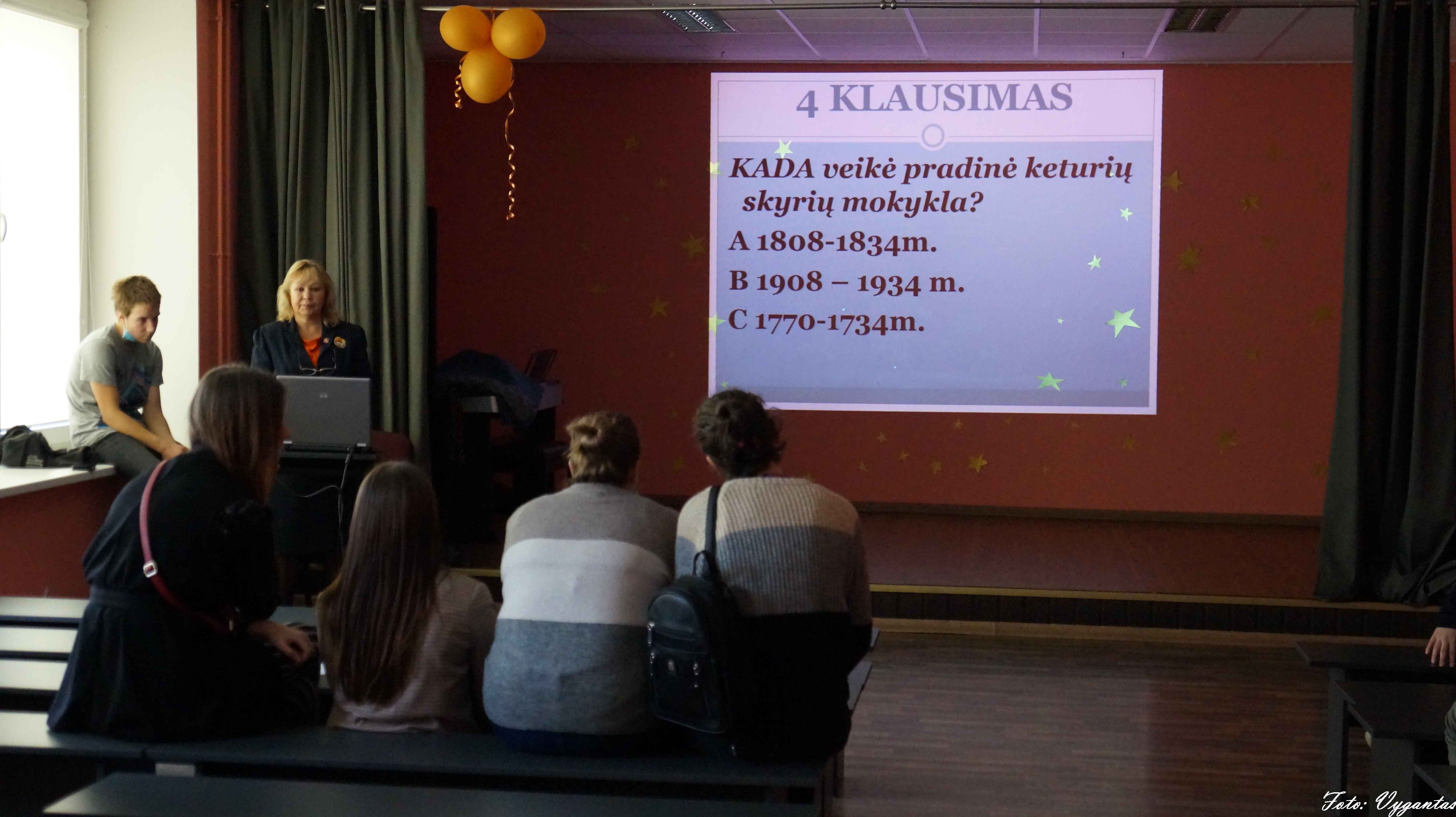 Po sportinių išbandymų klasių komandos dalyvavo protmūšiuose, kuriuos organizavo bibliotekininkė Jolanta Lašienė ir istorijos mokytoja Regina Narvydienė. Čia teko pademonstruoti žinias iš mokyklos bei Kamajų krašto istorijos. 5-8 kl. protmūšio nugalėtoja tapo 7 klasė, nuo kurios vos vienu tašku atsiliko aštuntokai, o vyresniųjų klasių grupėje ,,mūšį‘‘ laimėjo 2G komanda. Šventinė diena baigėsi linksmiausio nuotykio pristatymu: per pasakojimą, šokį ar vaidybinį numerį skleidėsi mokinių fantazija ir kūrybiškumas. Gimnazisto dienos įspūdžiais mokiniai dalinosi skanaudami ,,Darolos‘‘ dovaną — tortą (ačiū rėmėjams).