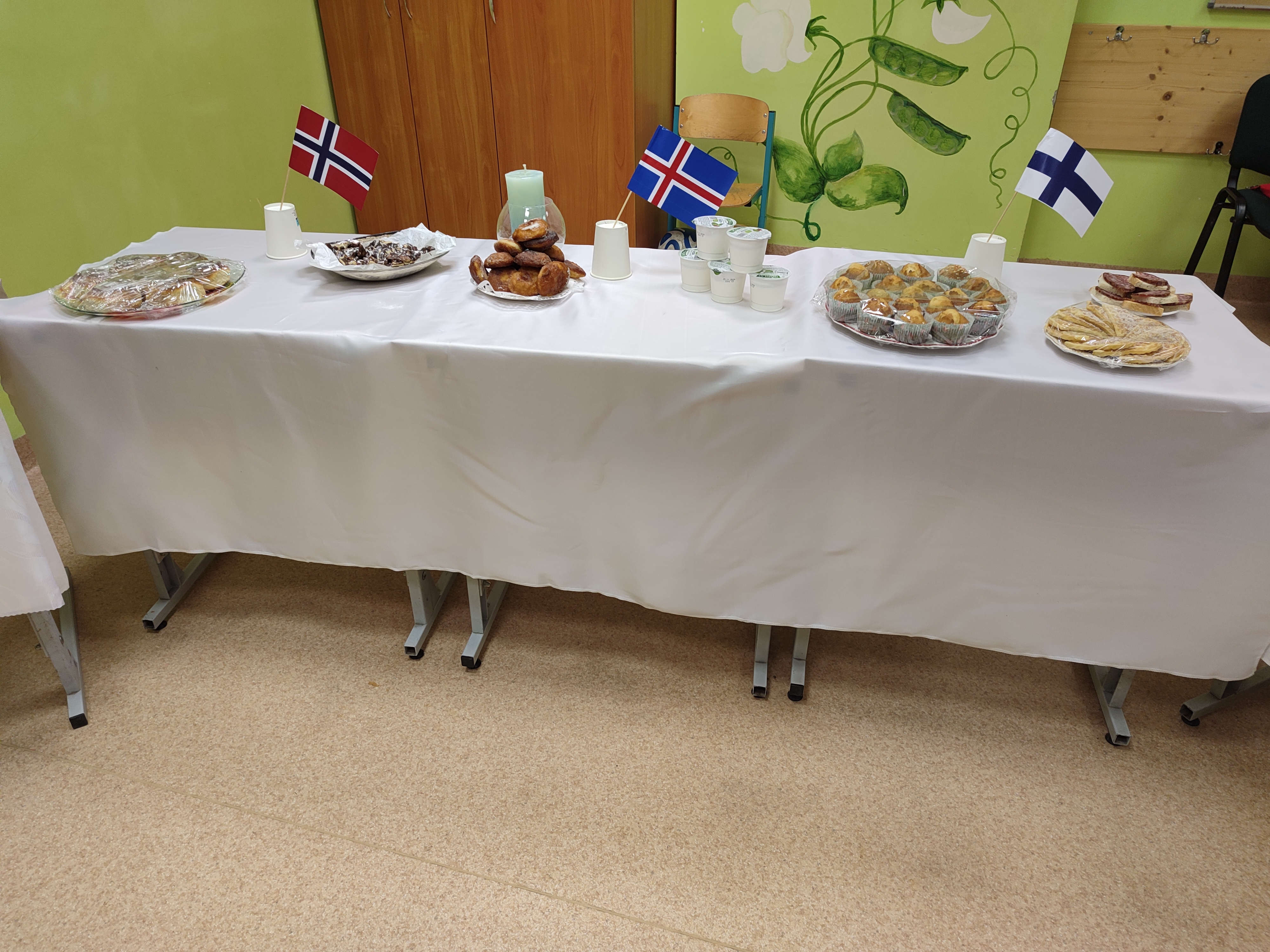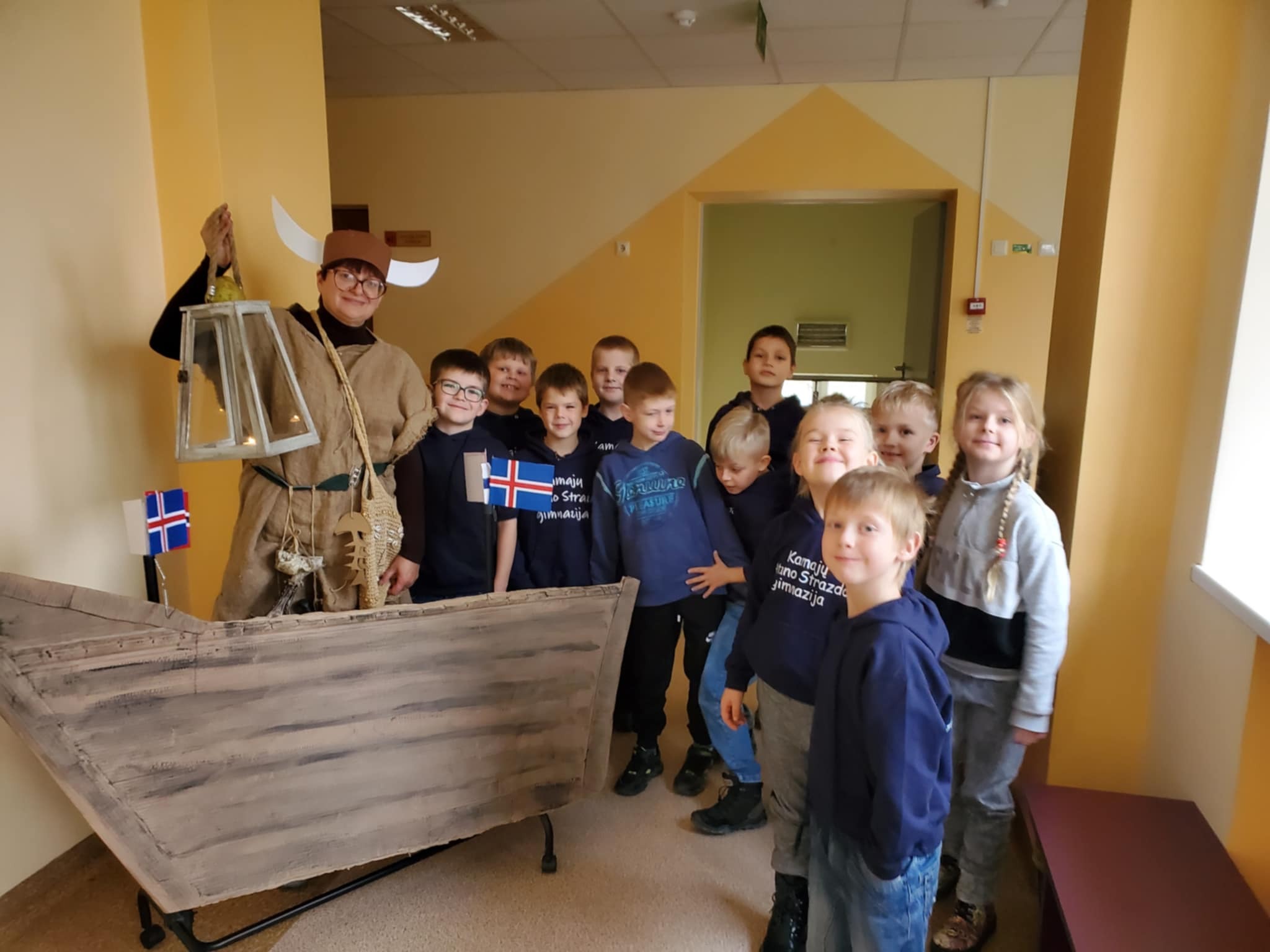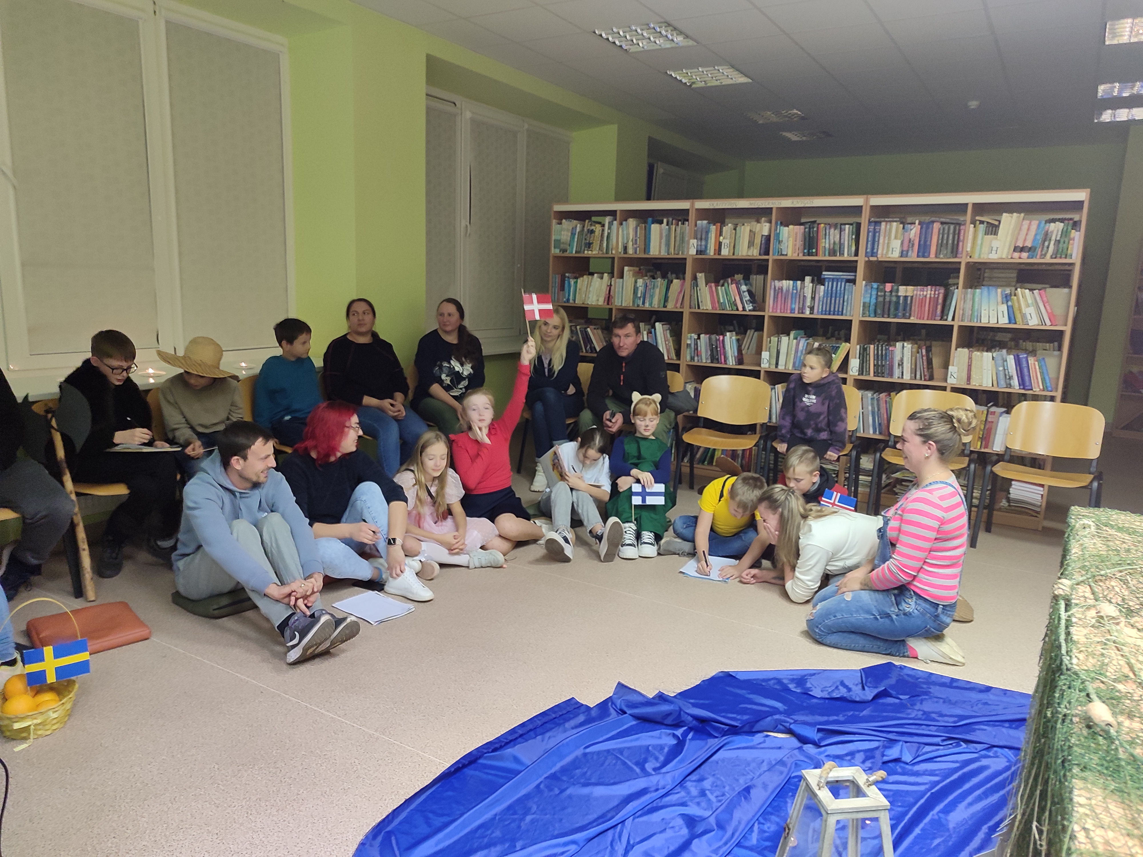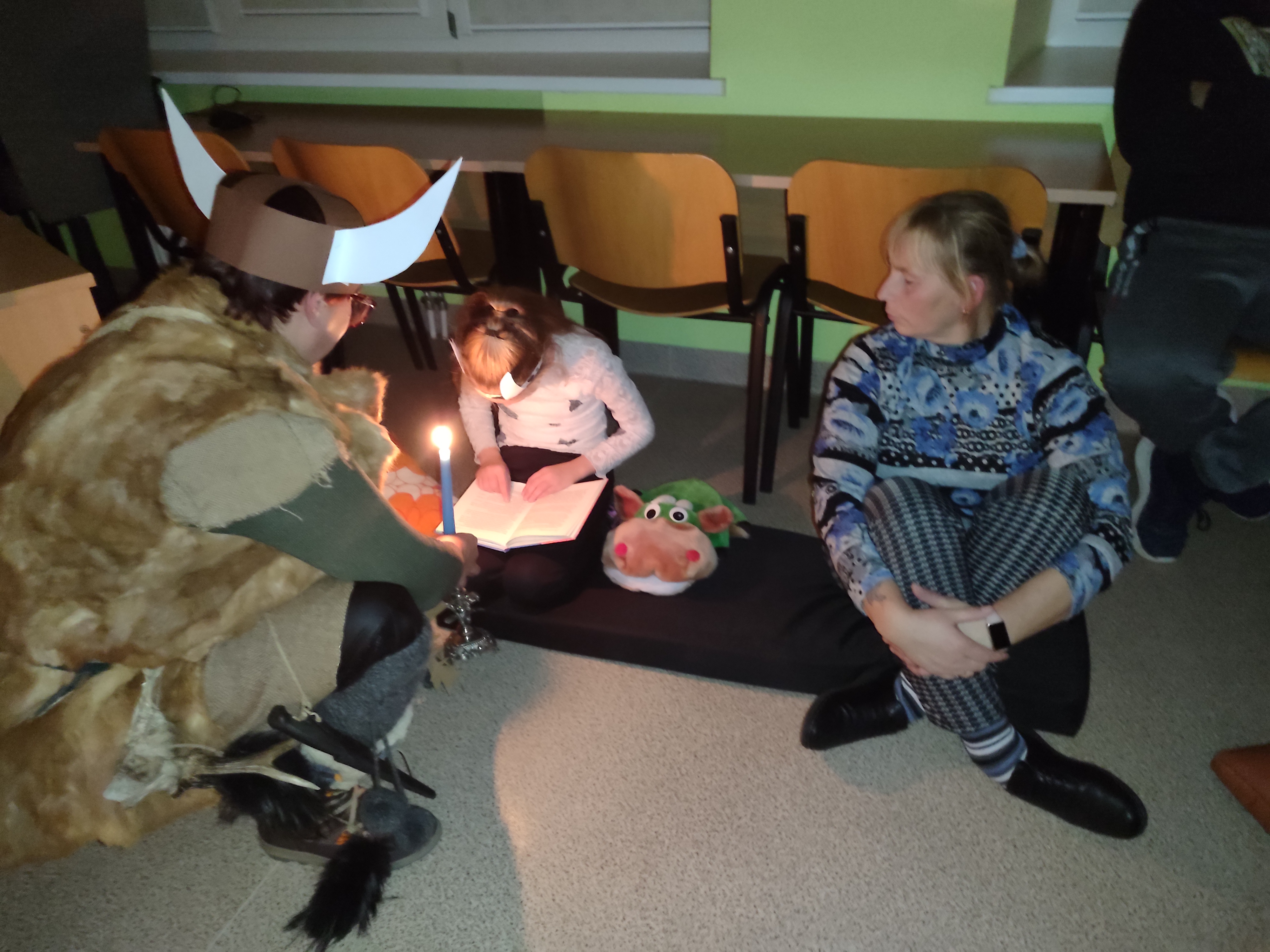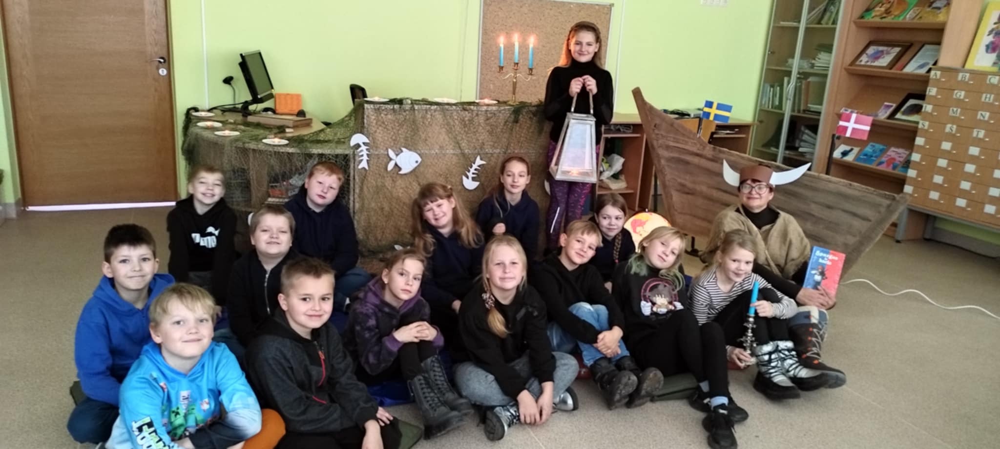 Mūsų gimnazijos bibliotekoje skaitymai „Sutemų valanda“ prasidėjo pirmadienio vakarą. Juose dalyvavo ketvirtos klasės bendruomenė — mokiniai, jų tėveliai ir mokytoja Rita. Labai smagu, kad dalis renginio dalyvių atvyko pasipuošę knygų herojų kostiumais. Čia dalyvavo vikingai, Mamulė Mū, Petsonas ir jo katinas Findusas, Pepė Ilgakojinė, Mergaitė su apelsinais, Karlsonas, Coliukė ir kt. Skaitėme ištraukas iš islandų rašytojos Kristin Steinsdottir knygos „Spurgos ir karis“. Vėliau jungtinės vaikų ir tėvelių komandos pasitikrino savo žinias viktorinoje apie Šiaurės šalis. Tėveliai pasirūpino šiaurietiškomis vaišėmis. Vakaro kulminacija — Finduso gimtadienio tortas!