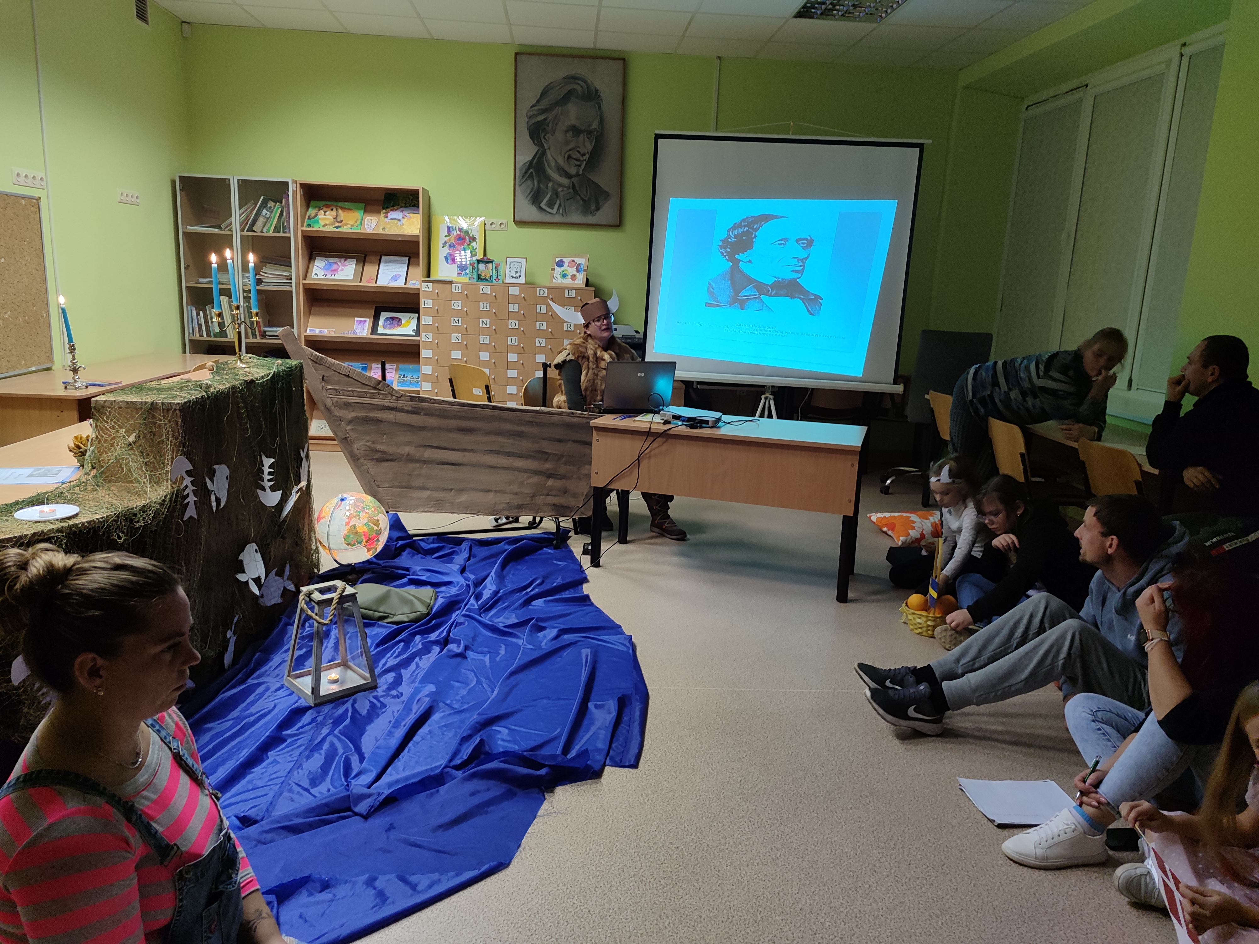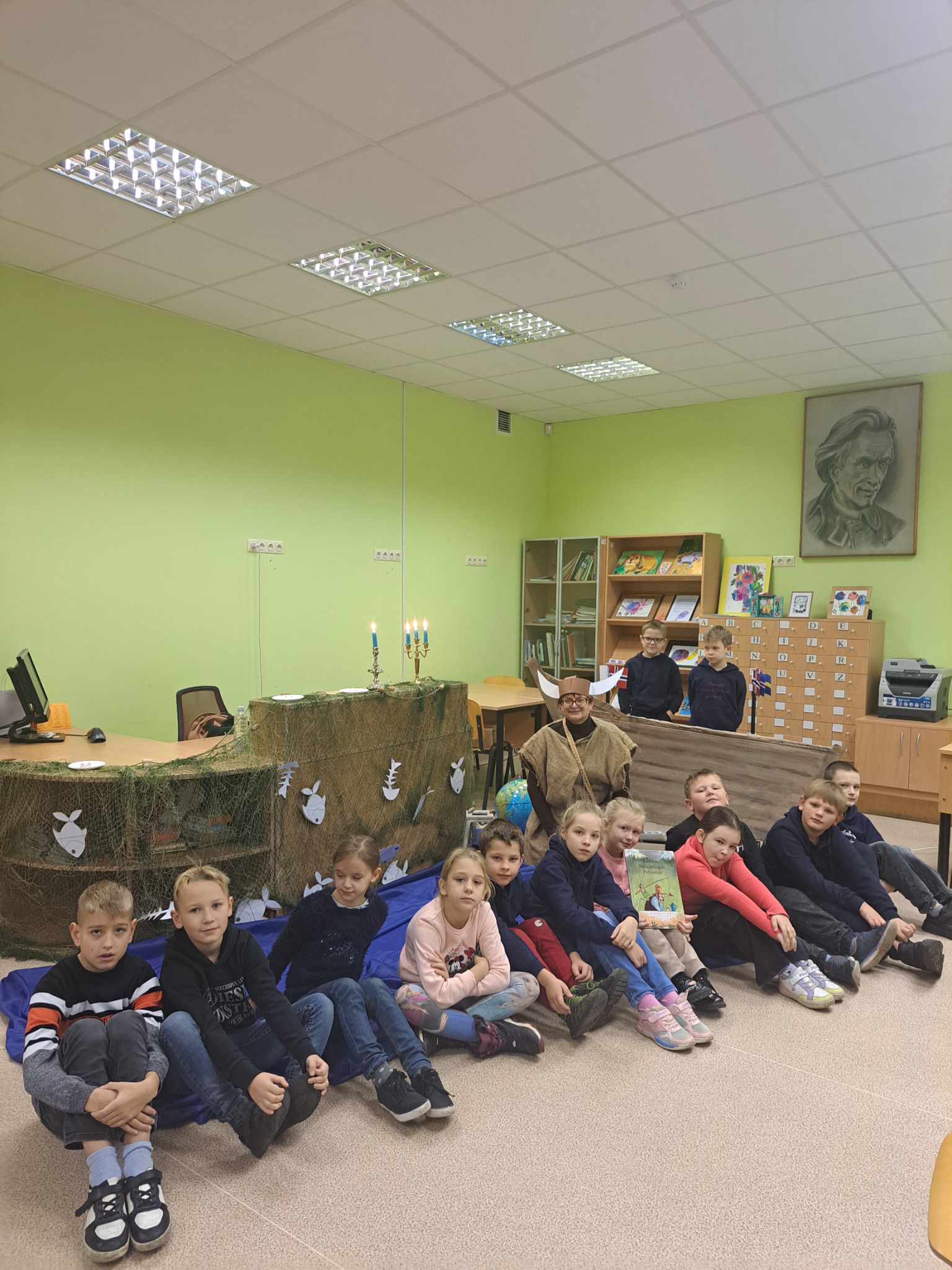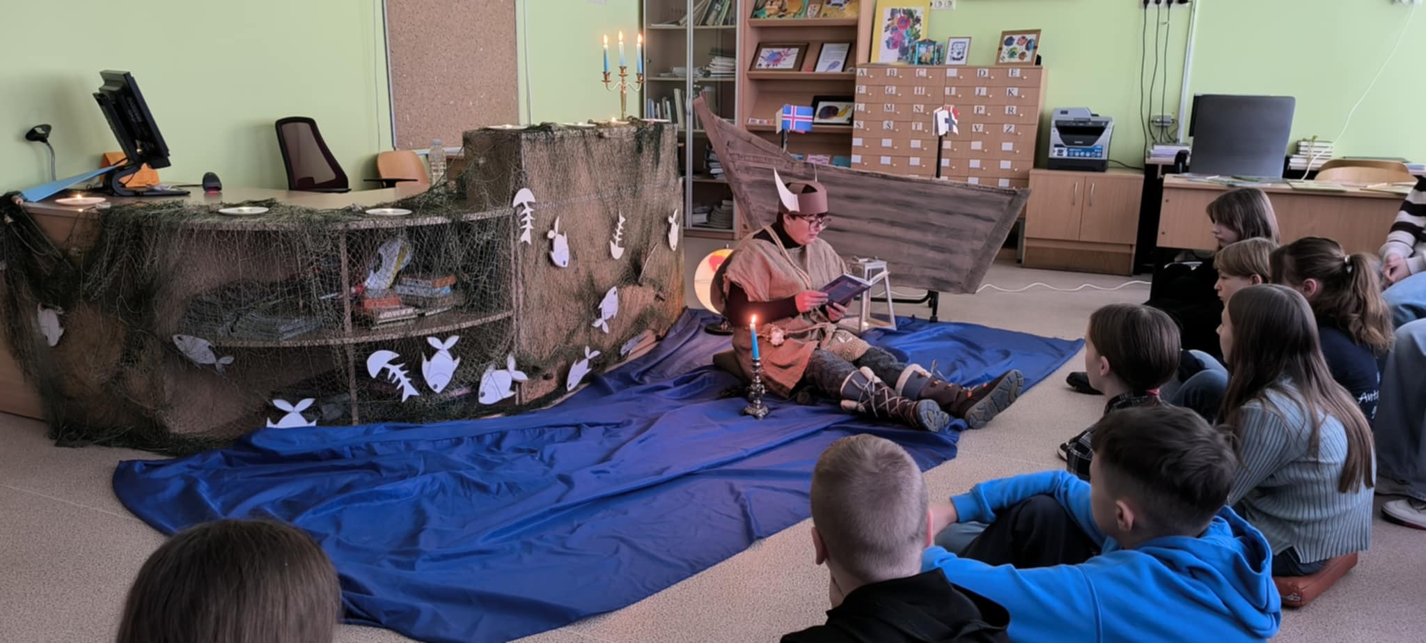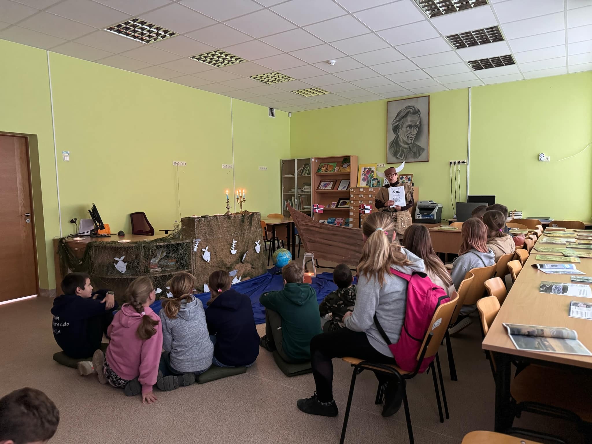 1-3 klasių ir 5-6 klasių mokiniai dalyvavo skaitymuose „Auštant“. Vikingo laivu „atplaukę“ į bibliotekoje įsikūrusią, žvakių apšviestą skaitymo salą, pradinių klasių mokiniai klausėsi švedų rašytojo Sven Nordqvist pasakojimo „Nelaimingas Petsonas“, o vyresnieji — jau minėtos „Spurgos ir karis“ ištraukų. Tekstai apie draugystę, pakantumą ir supratimą, artėjant Tarptautinei tolerancijos dienai, skatino susimąstyti...