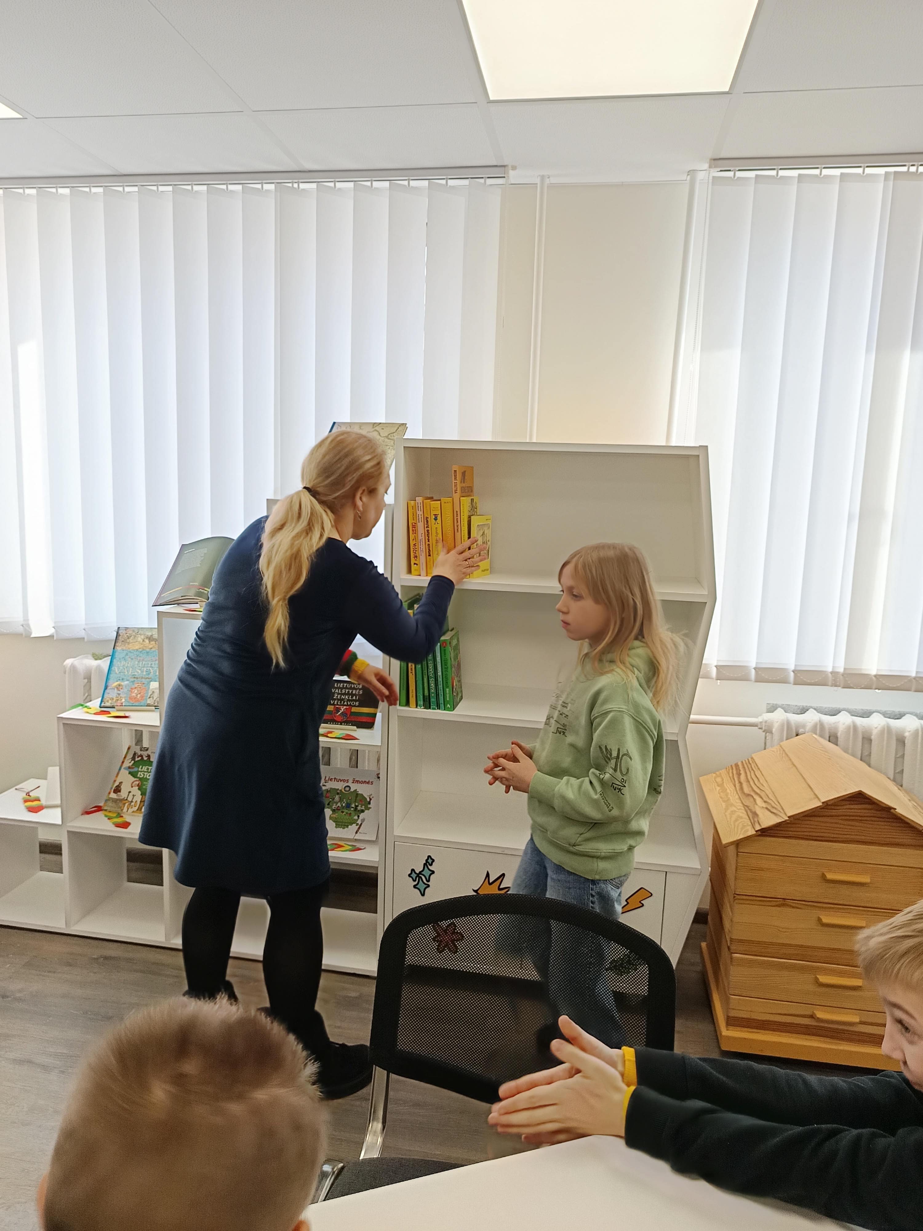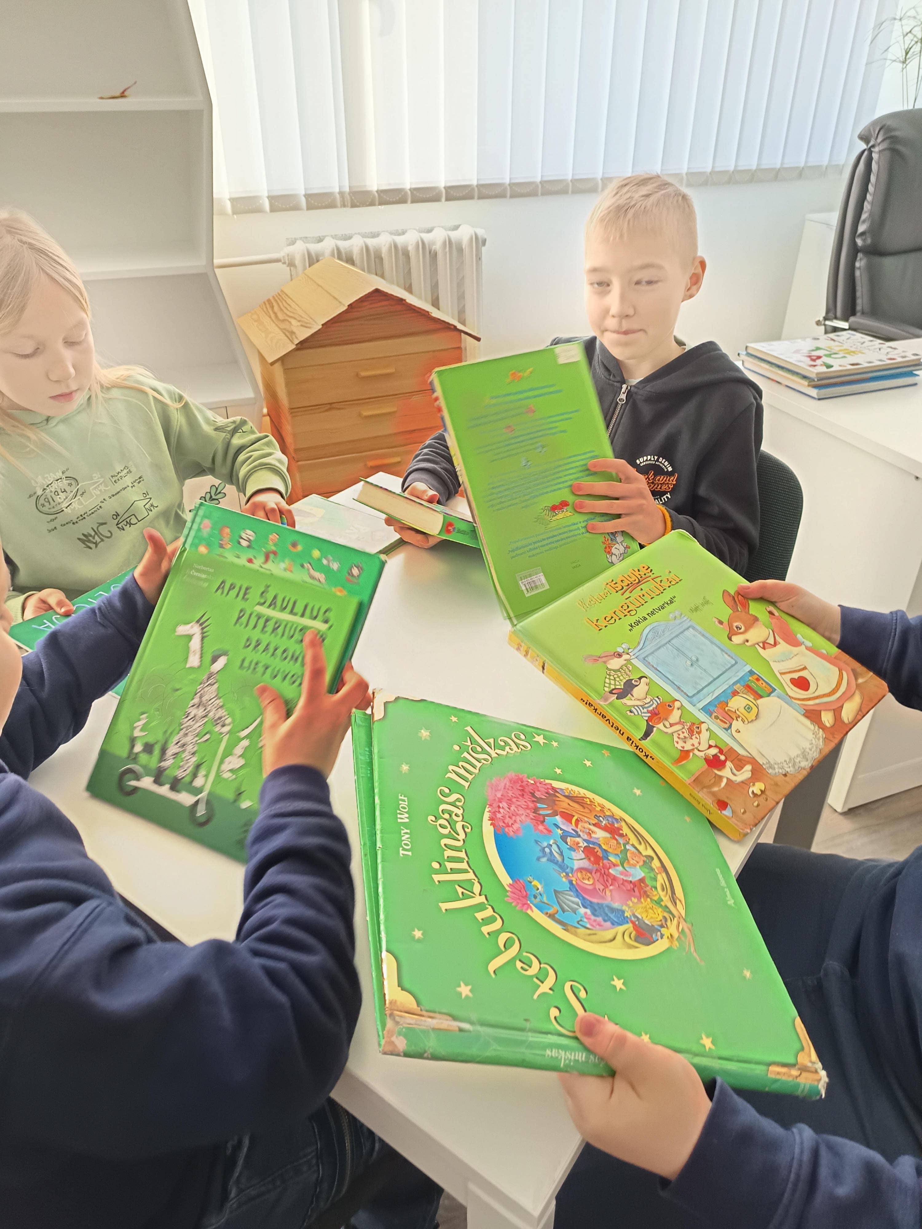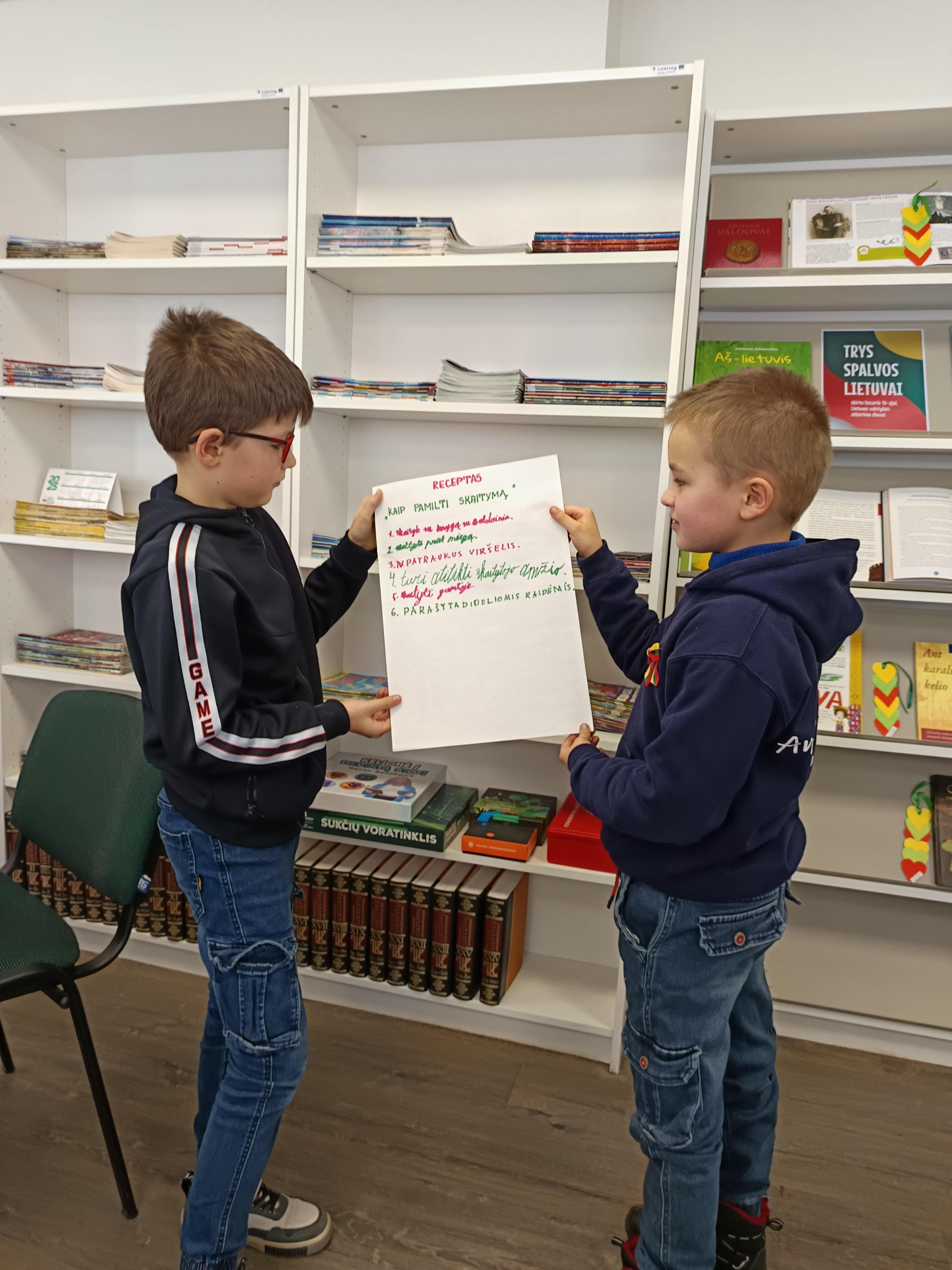 Rytmetį „Pažintis su knyga“, skirtą valstybės atkūrimo dienai, pravedė bibliotekininkė Aušra. Trečiokai grupėse kūrė receptą „Kaip pamilti skaitymą“, ieškojo knygose Lietuvos simbolių, atliko užduotį „Pasakojimai iš spalvotų knygų“, surado knygose linksmas istorijas ir jas pristatė, dėliojo į lentynas knygas pagal vėliavos spalvas.
