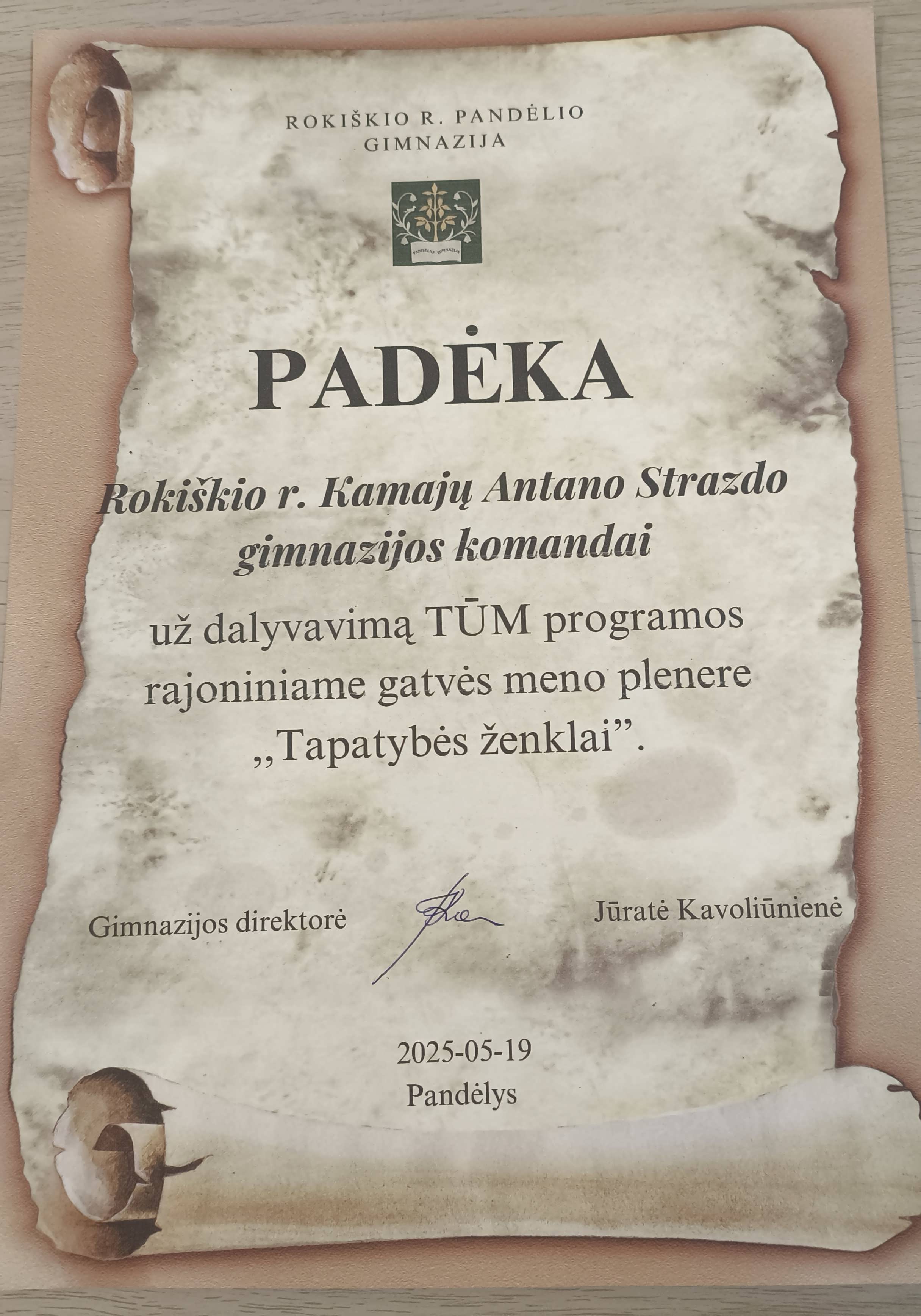 Gegužės 19 d. mūsų gimnazijos 5 mokinių komanda ( IIg klasės mokinės Milena, Karina, Gabija, Mingailė ir Judita) dalyvavo rajoniniame gatvės meno plenere „Tapatybės ženklai“, kuris vyko Rokiškio r. Pandėlio gimnazijoje.