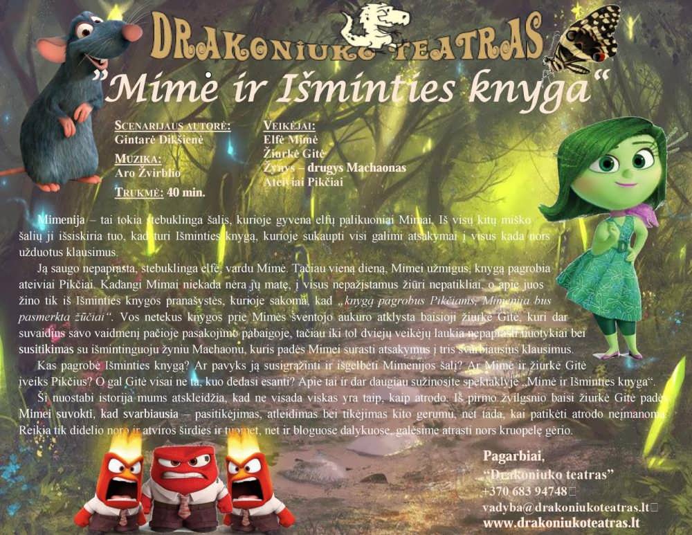 Gegužės 7-sios rytmetis pradinukams bei NŠS estetikos studijos vaikams prasidėjo nuotaikinga muzikine edukacine istorija. Mažieji žiūrovai stebėjo spektaklį „Mimė ir išminties knyga“. Veikėjai – Mimė, Gitas ir Machaonas, pasekė istoriją, kad ne visada viskas yra taip, kaip atrodo, kad pirmas įspūdis gali suklaidinti. O svarbiausia – pasitikėjimas, atleidimas bei tikėjimas kito gerumu. Reikia tik didelio noro ir atviros širdies ir tuomet, net ir bloguose dalykuose, galėsime atrasti nors kruopelę gėrio. Vaikai liko sužavėti aktorių vaidyba, spalvingais kostiumais, dekoracijomis, nuostabiai atliktomis dainomis.