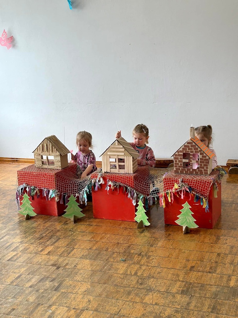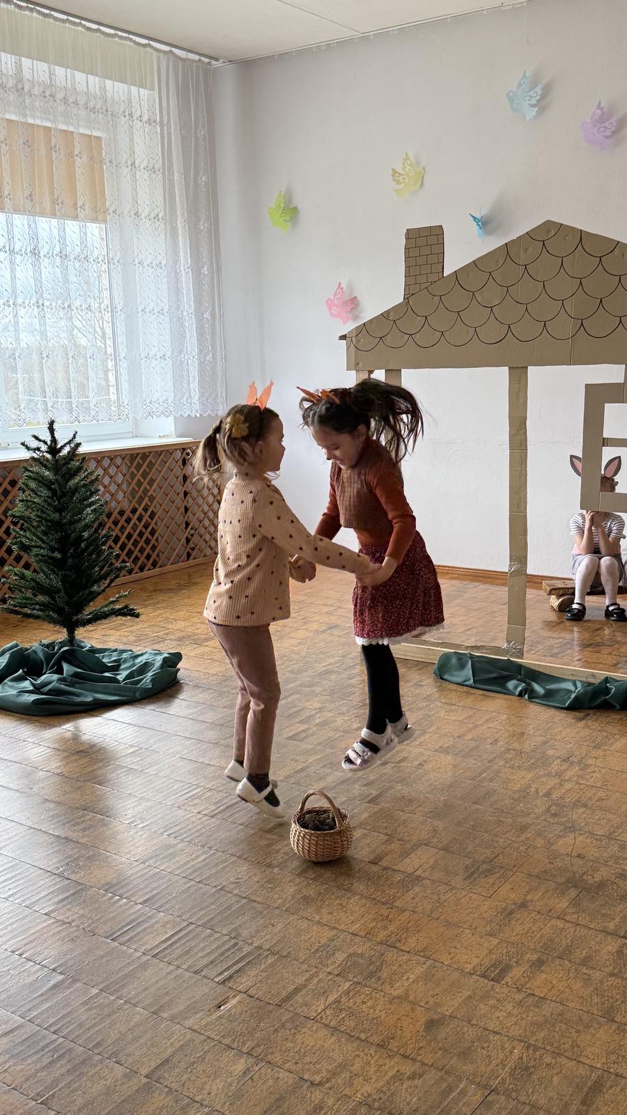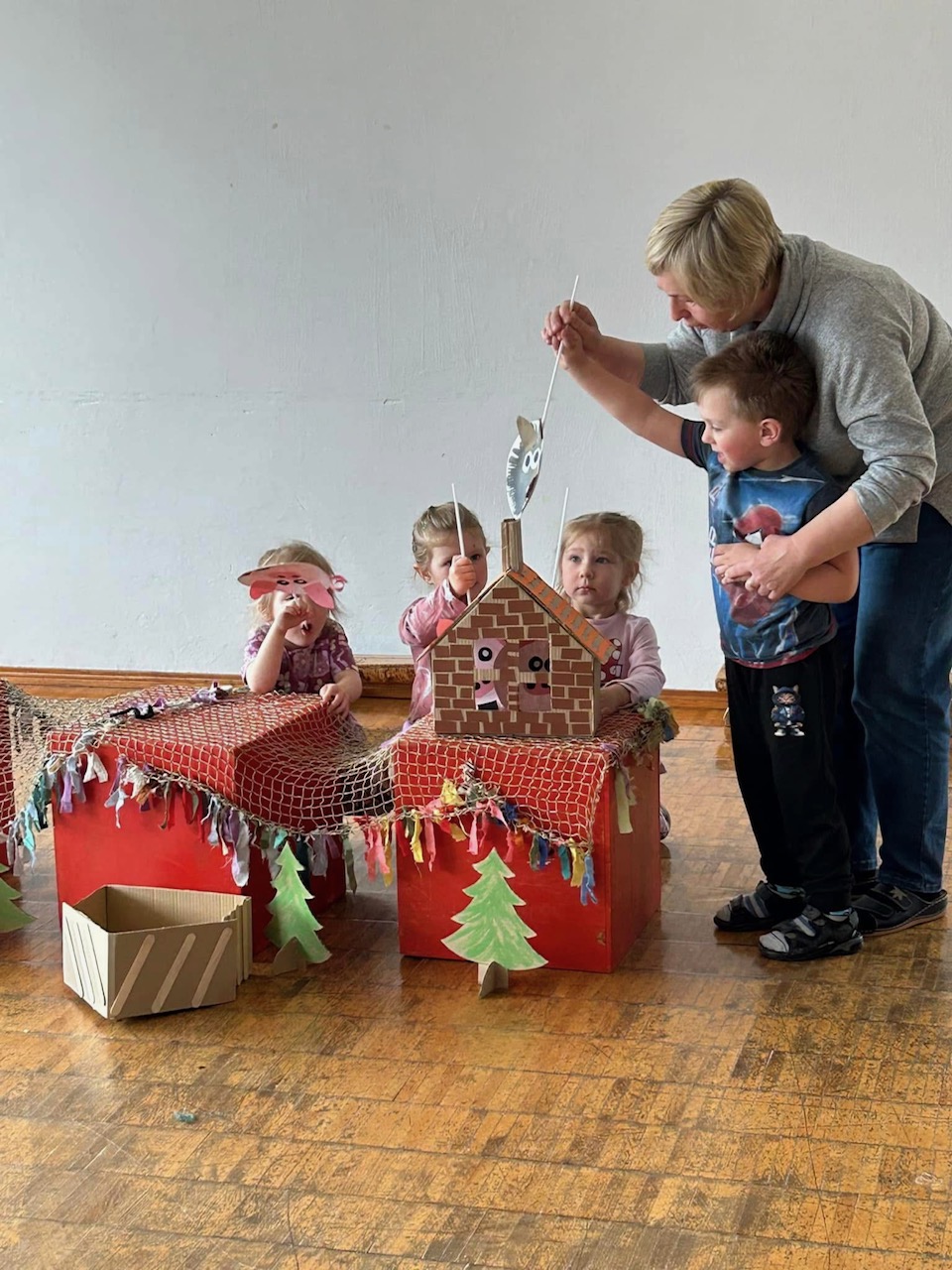 Linksmai nusiteikę vaikai ir mokytojos žiūrėjo ,,Kiškučių“ grupės vaikų rodomą spektakliuką ,,Trys paršiukai“. ,,Boružėlių“ grupės vaikai inscenizavo pasaką ,,Kas namelyje gyvena?“. ,,Nykštukai“ pakvietė pažiūrėti spektakliuką ,,Dangus griūva“.