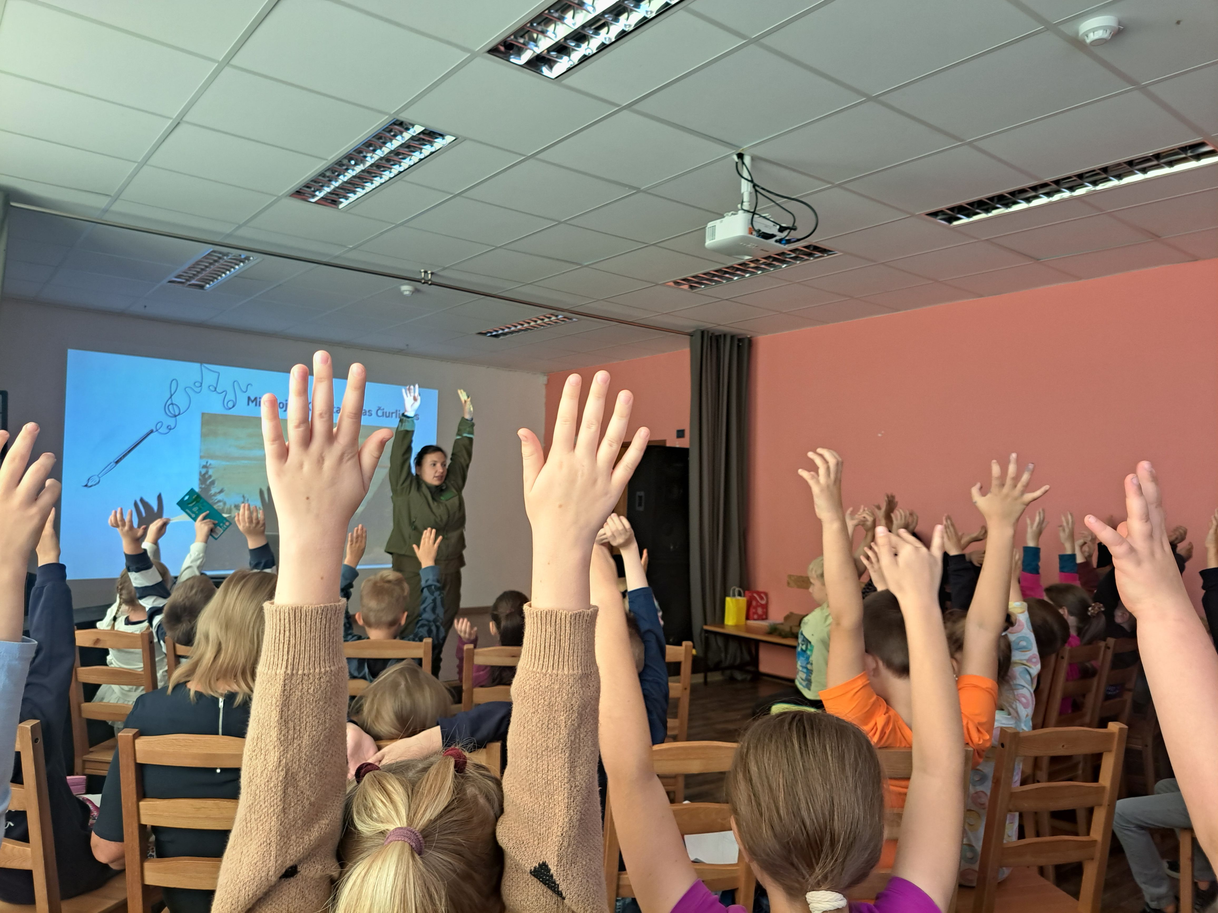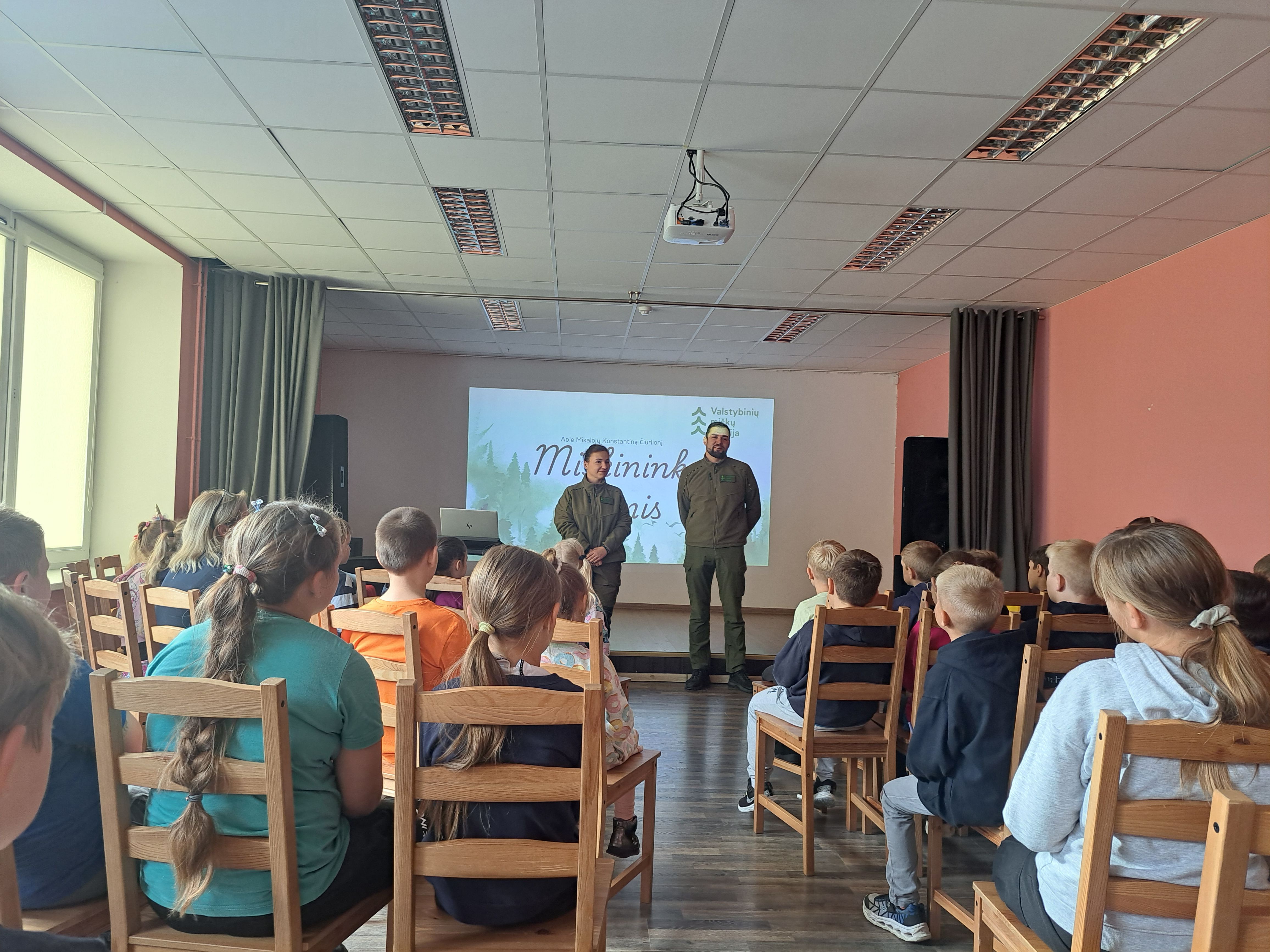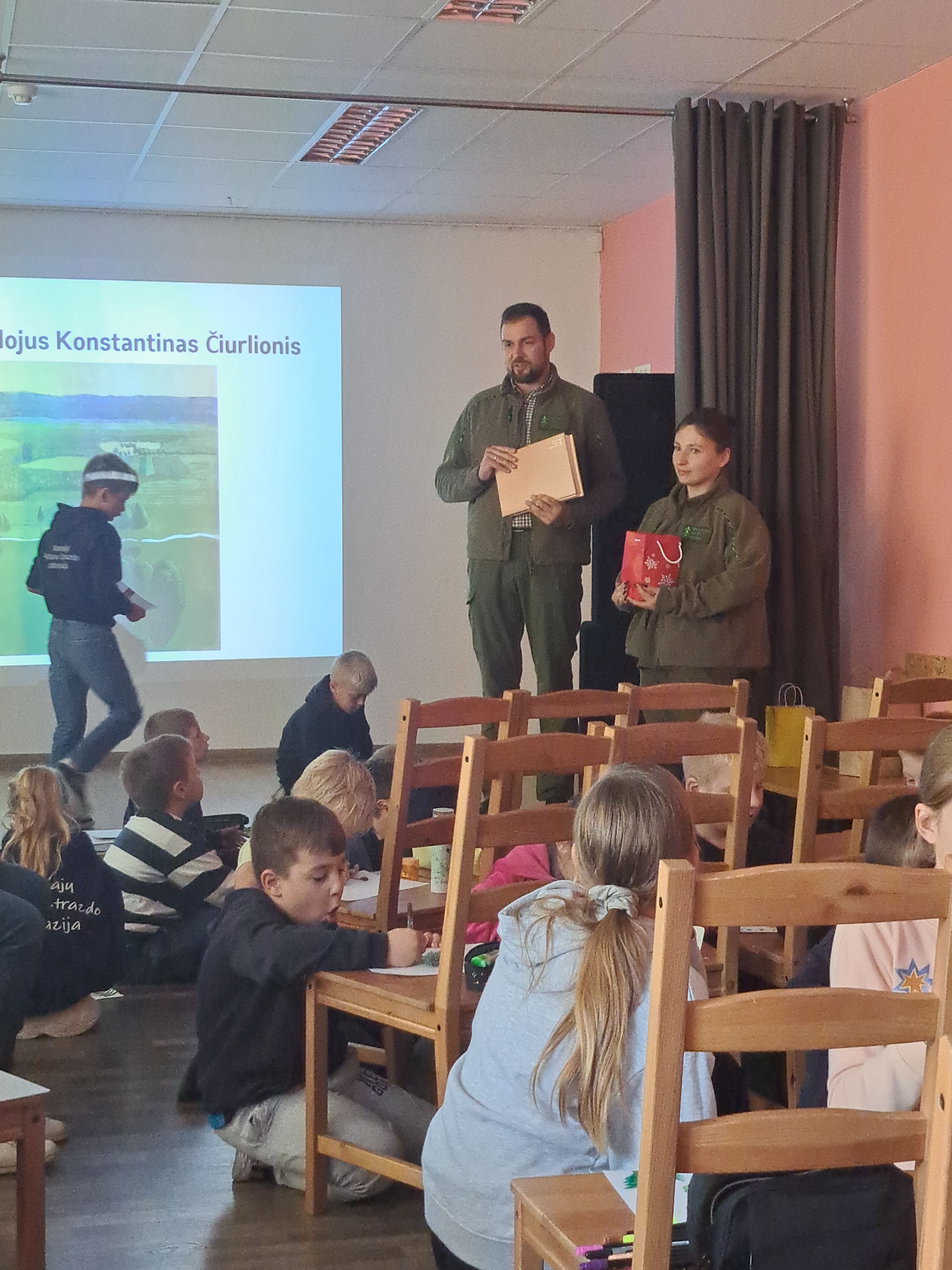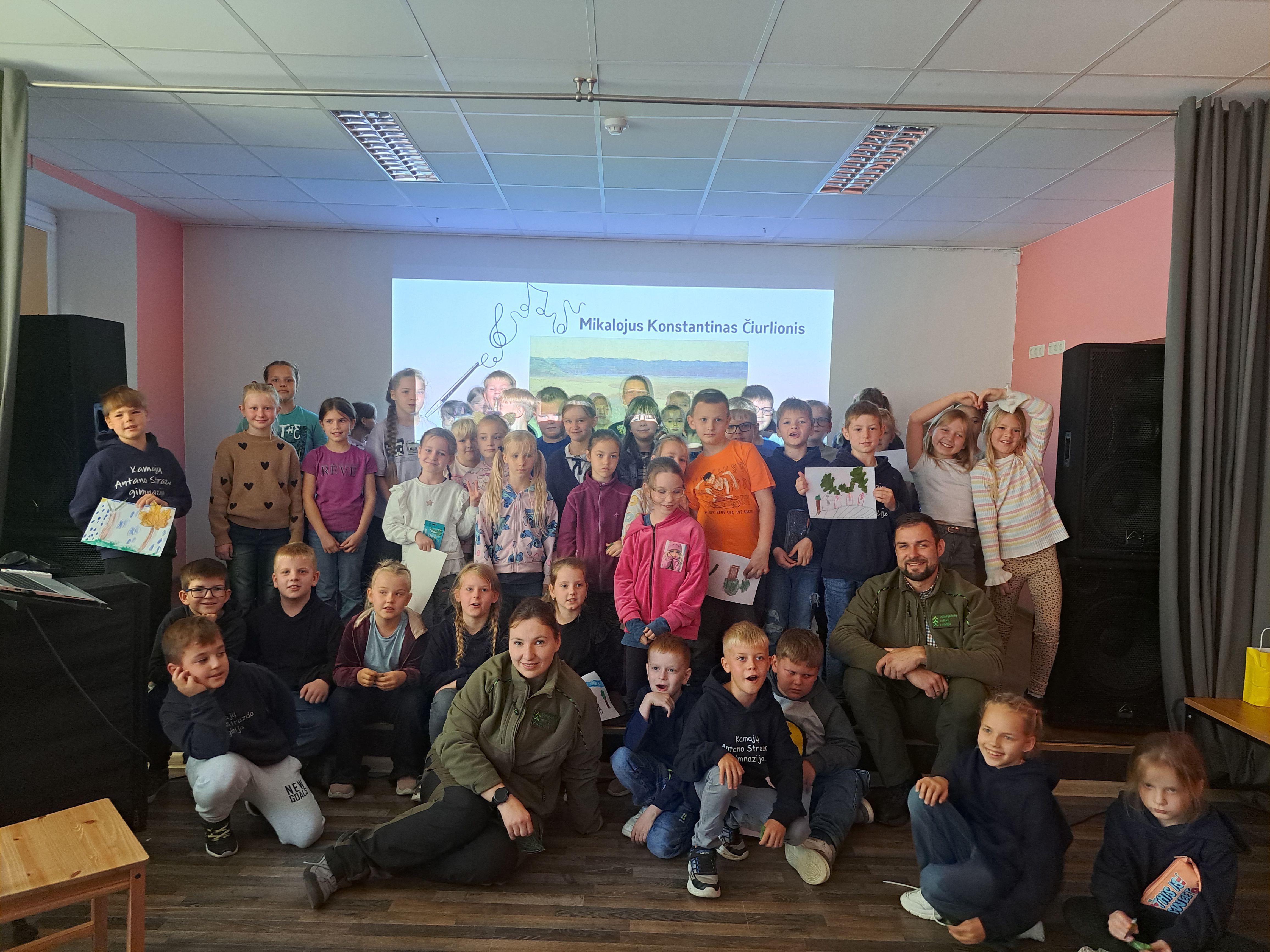 Minint M. K. Čiurlionio 150-ąsias gimimo metines, mokyklos pradinių klasių mokiniai rinkosi į įdomiąją pamoką „M. K. Čiurlionis miškininkų akimis“, kurioje susitiko su Rokiškio regioninio padalinio Juodupės girininkijos specialiste – mentore Jolita Šliakiene ir Rokiškio regioninio padalinio vyriausiuoju miškininku – mentoriumi Justu Vojaga. Mokiniai klausė gamtininkų pasakojimų apie visokeriopą miško naudą žmogui, virtualiai keliavo M. K. Čiurlionio gyvenimo, kūrybos keliais. Galėjo pamatyti net senąjį kompozitoriaus pianiną, išvysti tikrą vaizdą ir dailininko sukurtą meno kūrinį… Gamtininkų atnešti įvairūs miško augalai, medžių nuotrupos, sėklos tapo… mokinių piešinių detalėmis. Smagūs darbai buvo įvertinti dovanomis. Ačiū už galimybę į kasdienybę pažvelgti mažųjų menininkų akimis.