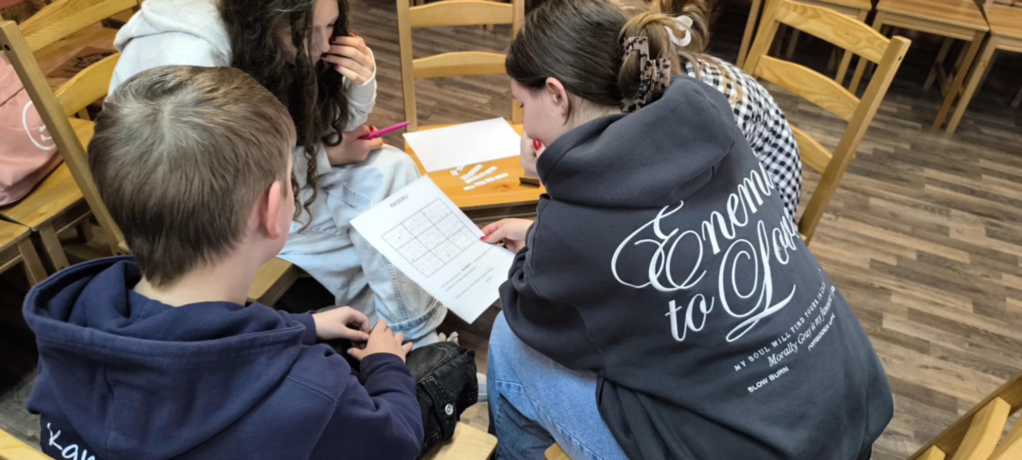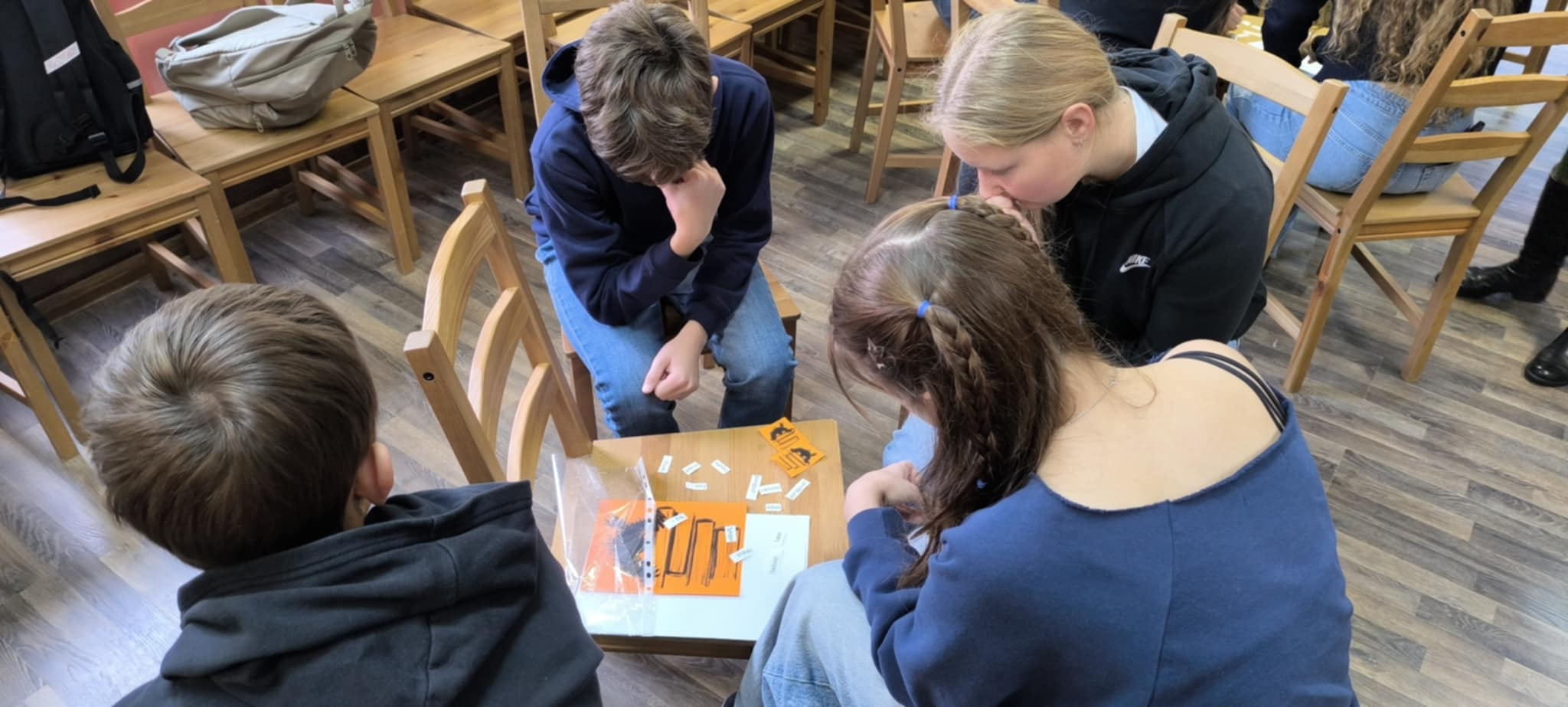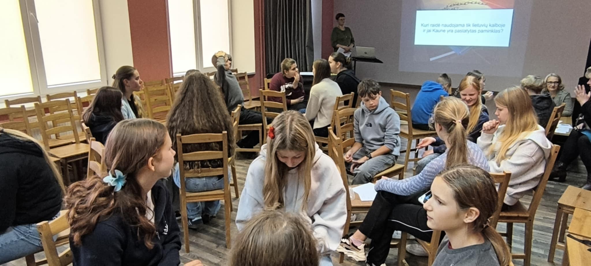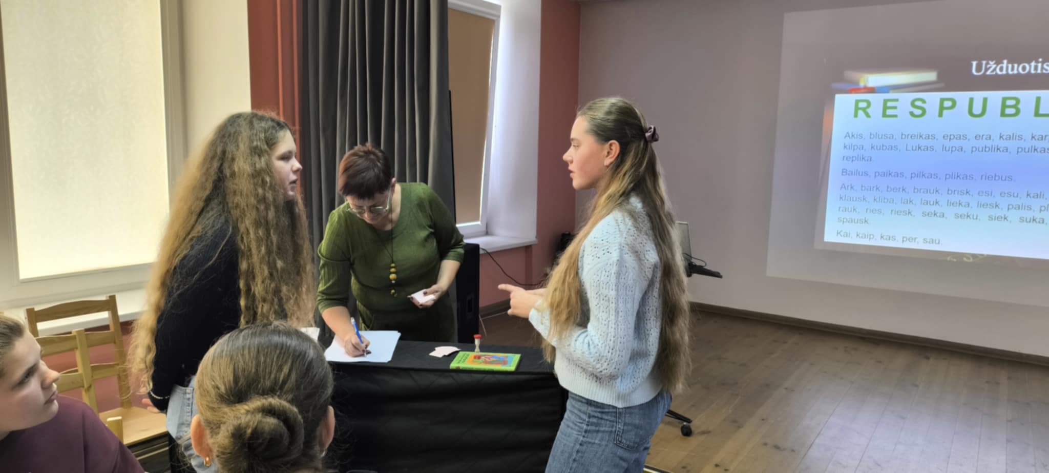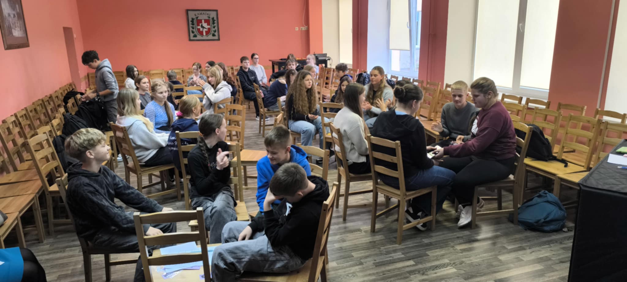 Pavasarį mūsų gimnazijos 5-8 klasių atstovai buvo nuvykę į Pandėlį pirmam kūrybinių dirbtuvių „Knygų sala“ užsiėmimui. Spalio 28 d. sulaukėme atsakomojo svečių iš Pandėlio gimnazijos vizito.