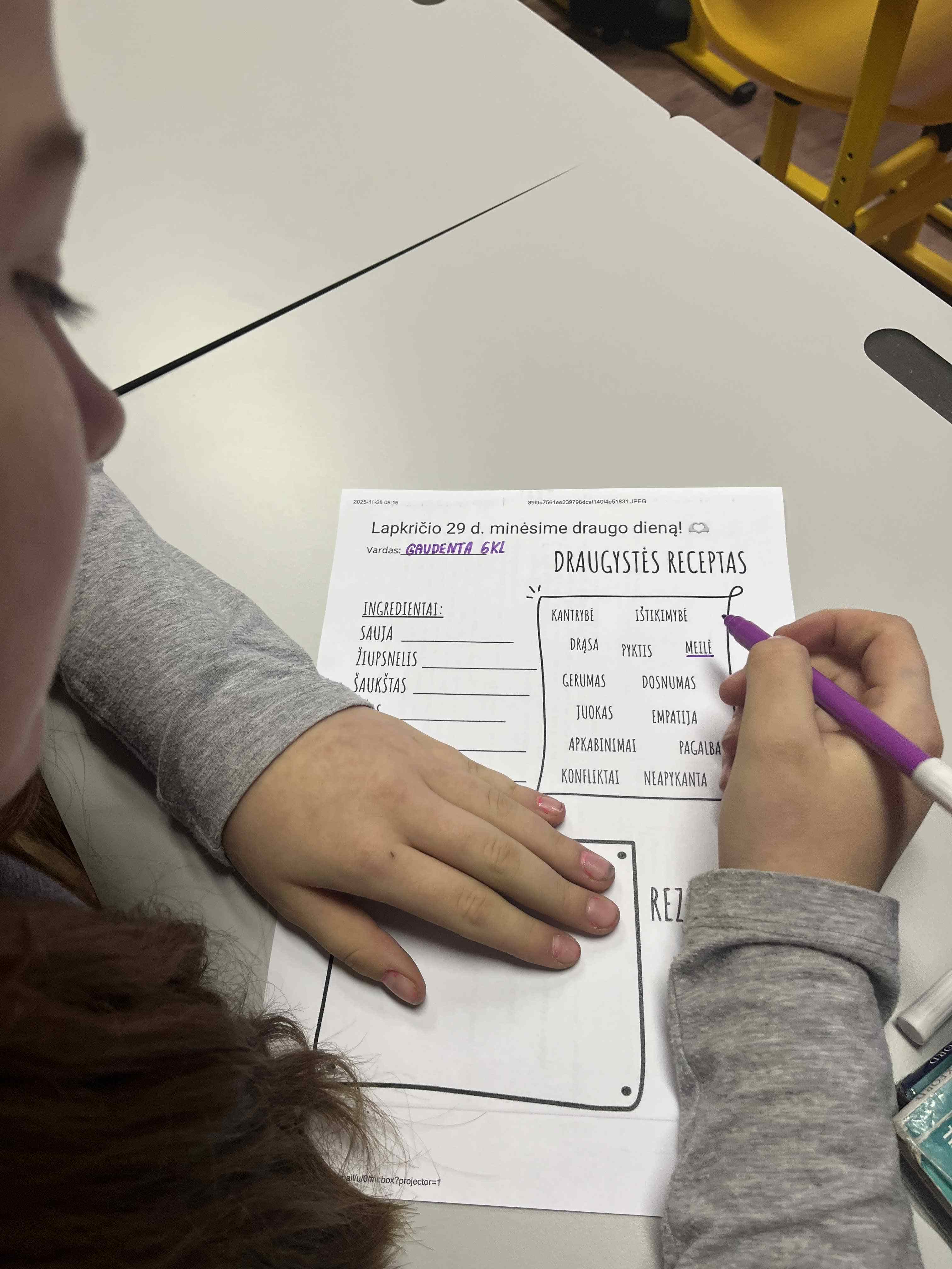 Lapkričio 29-ąją minima tarptautinė draugo diena. Todėl penktadienį, per pirmą pamoką, vykdydami akciją „Tikras draugas“, mokiniai ir mokytojai drauge ieškojo „Draugystės receptų“. Klasėse vyko pokalbiai apie tikros draugystės vertę, bendrystę, empatiją ir tarpusavio pagalbą. Dešimtokai atliko testą „Ar esi geras draugas“, devintokai, ketvirtokai ir pirmokai rinko savo klasės geriausią draugą. Nemaža klasių dalis žiūrėjo ir aptarė filmą „Flow“, kuris paskatino apmąstyti ir įvertinti veikėjų santykius, jų poelgius.