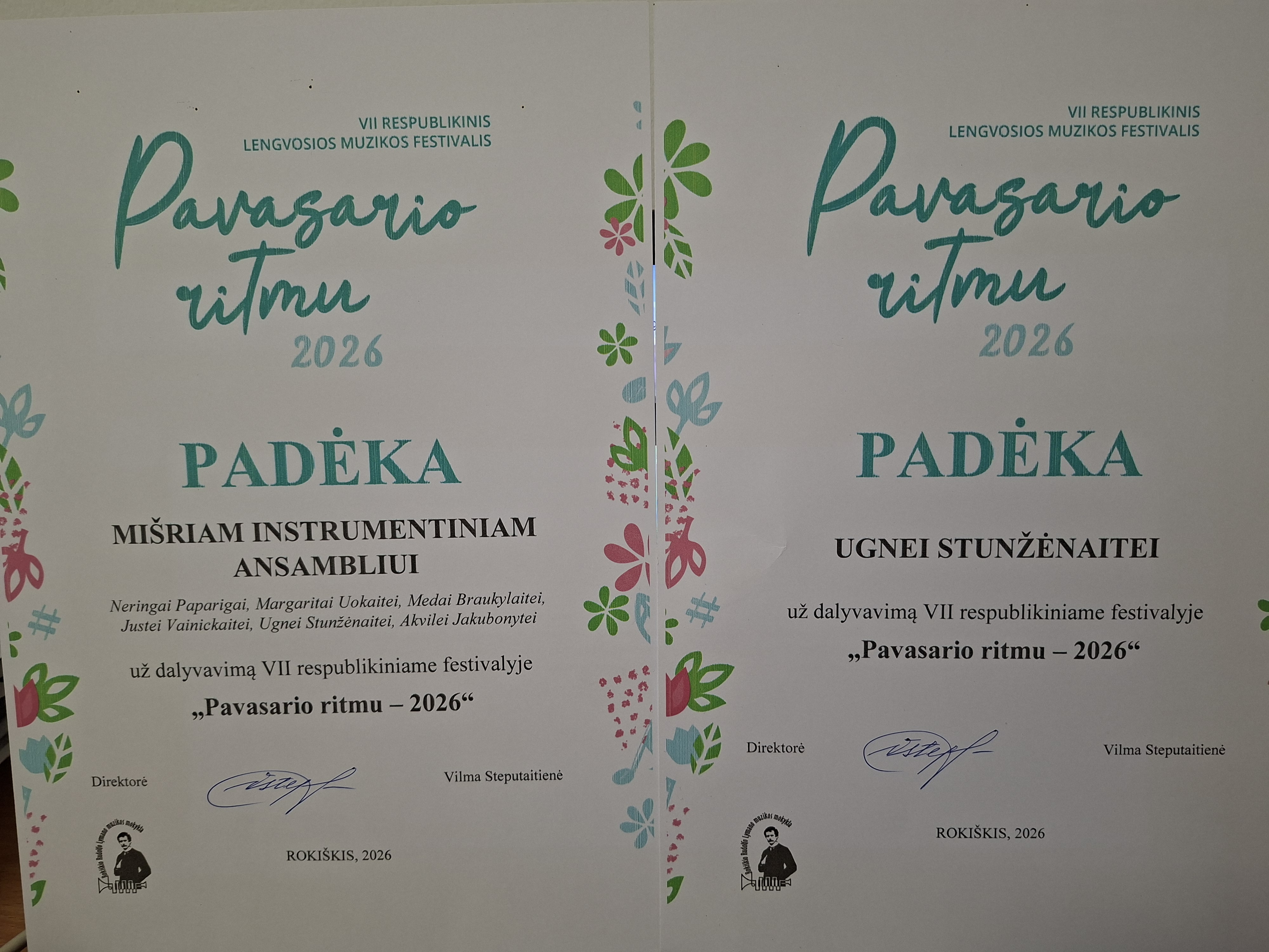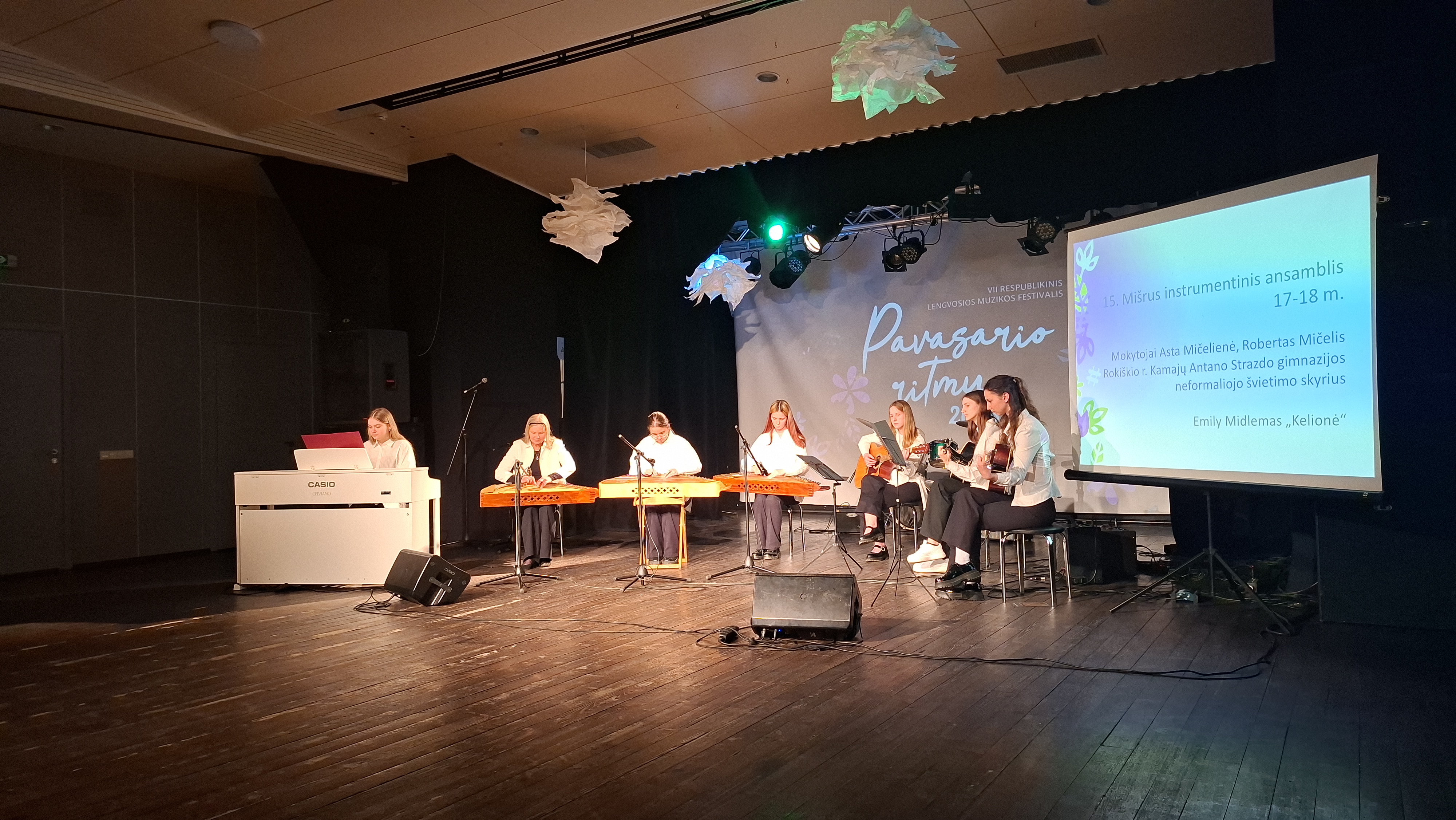 Š. m. balandžio 15 d. Rokiškio kultūros centre vyko VII respublikinis lengvosios muzikos festivalis ,,Pavasario ritmu 2026“. Mūsų gimnazijos NŠS gitaros ir kanklių studijų mokinių ansamblis: Ugnė Stunžėnaitė, Meda Braukylaitė, Akvilė Jakubonytė, Justė Vainickaitė, Neringa Papariga, Margarita Uokaitė atliko instrumentinį kūrinį, o Ugnė dar dainavo solo, pritardama gitara. Buvo smagu paklausyti kitų, po renginio pabendrauti. Ačiū organizatoriams – Rokiškio Rudolfo Lymano muzikos mokyklai už kvietimą dalyvauti, šiltas padėkas ir atminimo dovanėles.