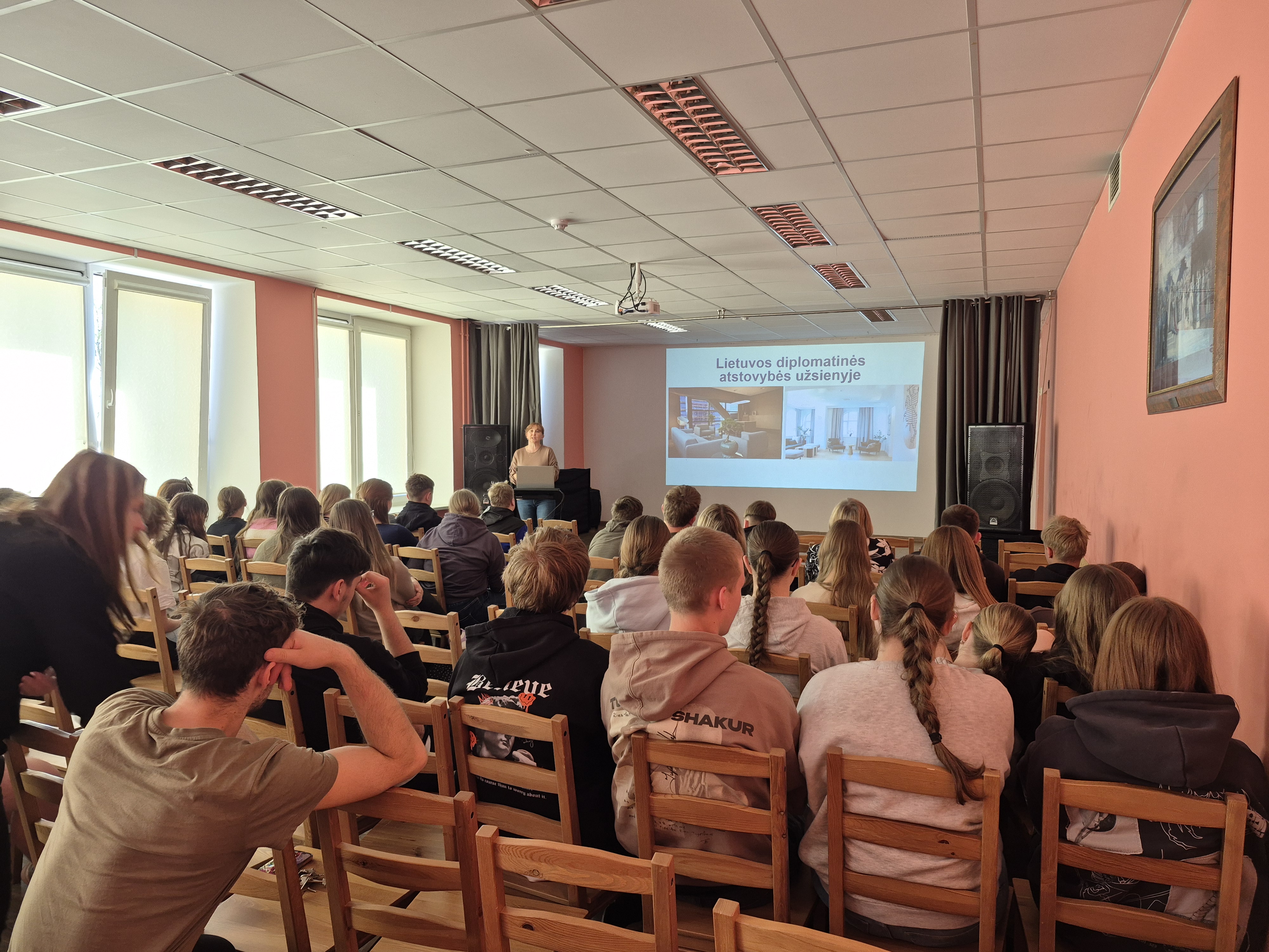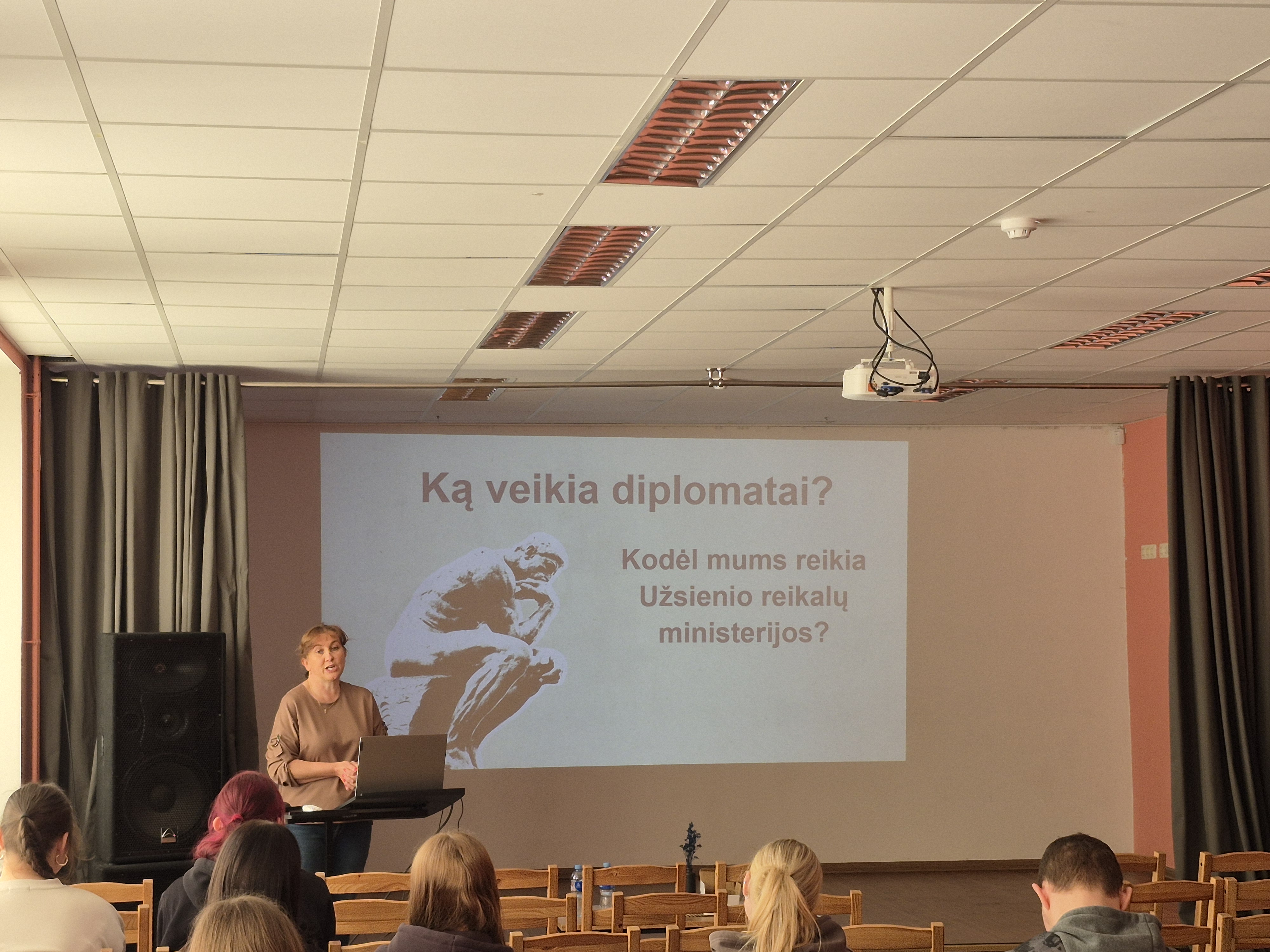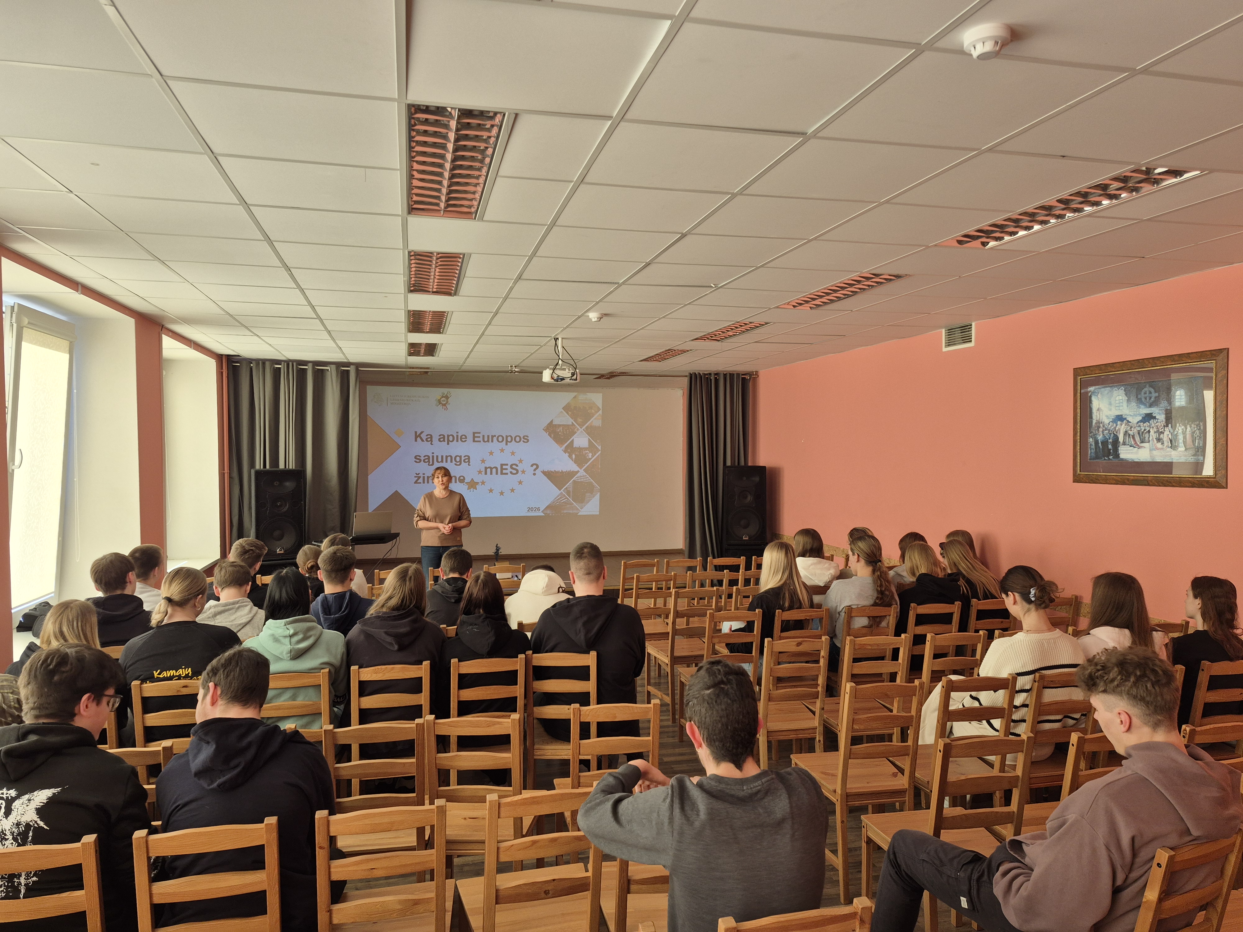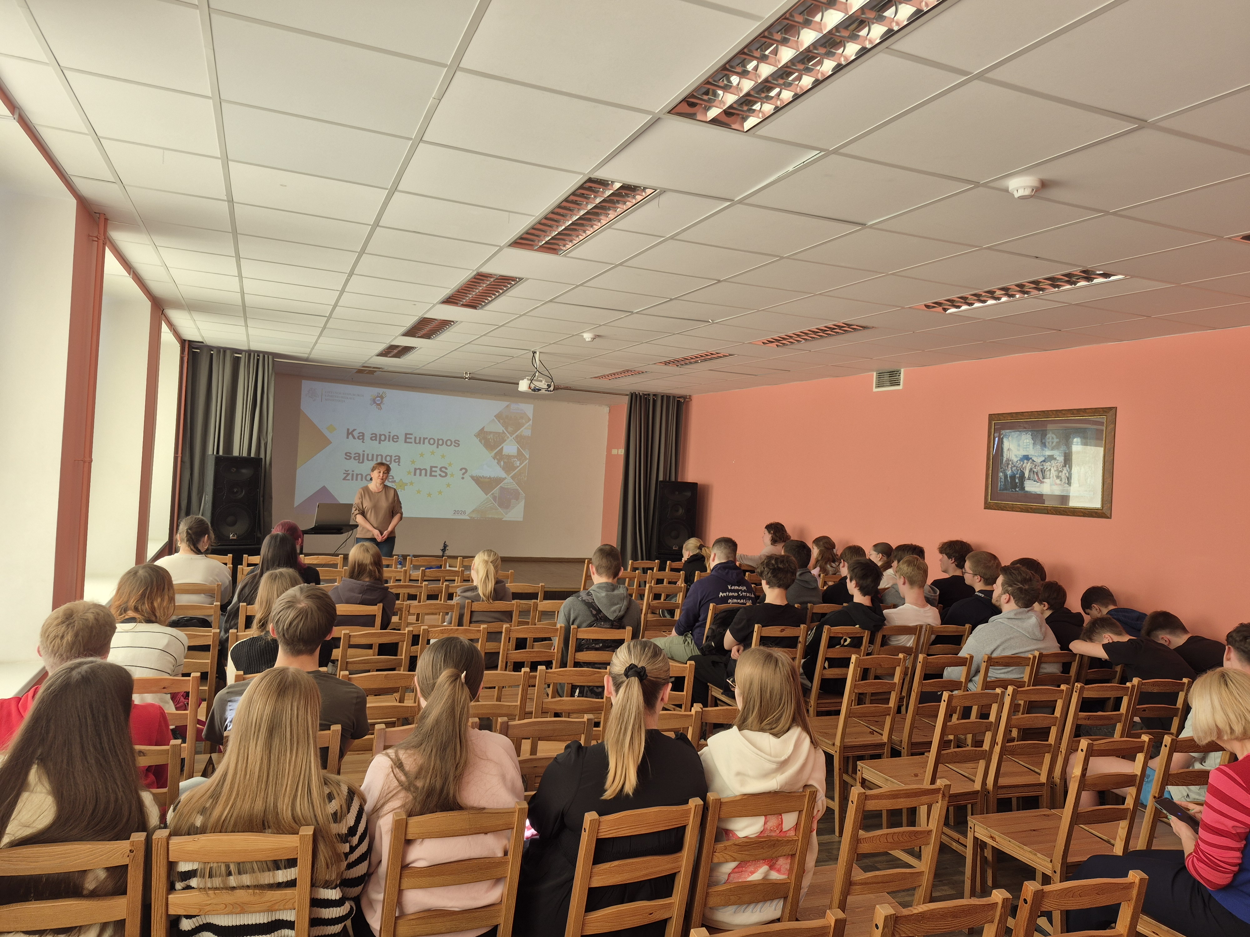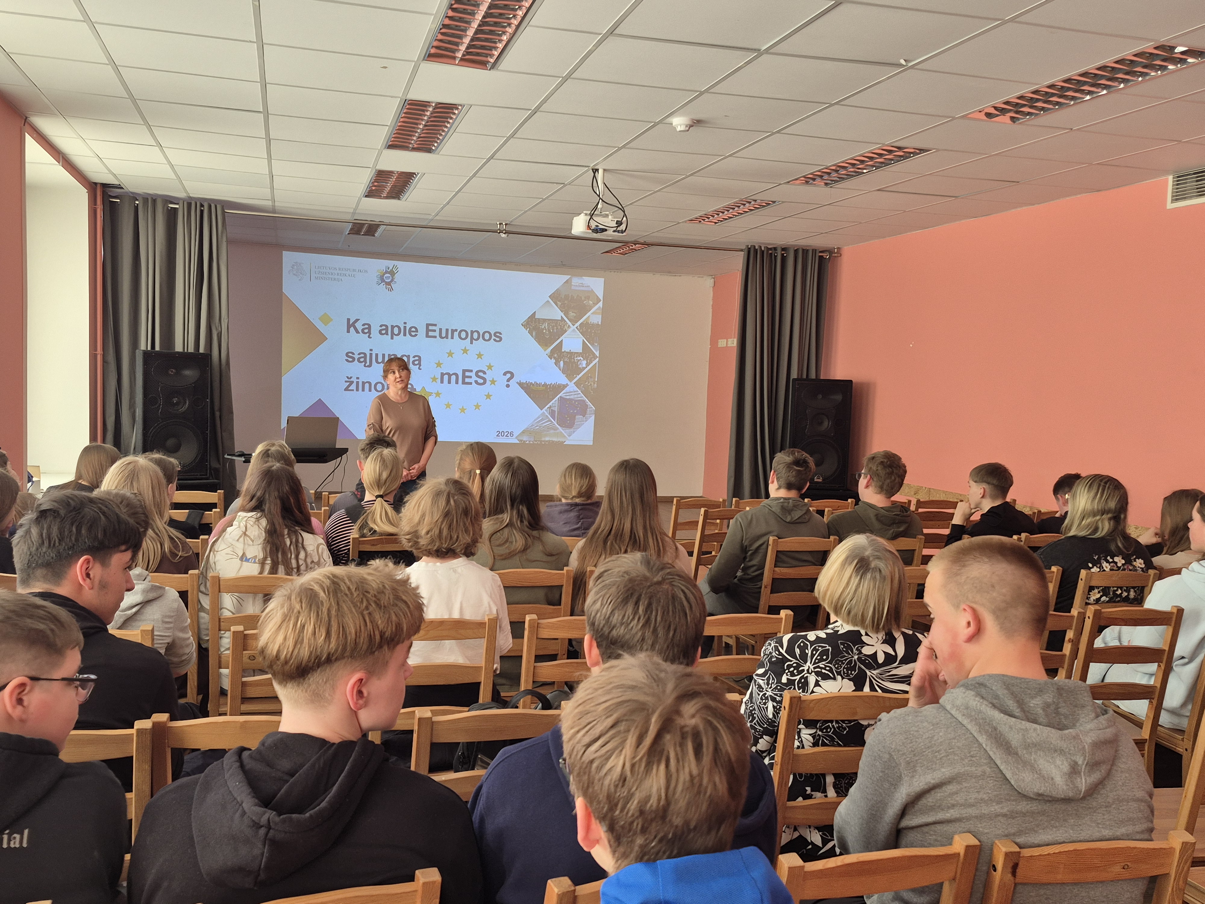 Balandžio 22 dieną gimnazijoje lankėsi patarėja Tereza Stanienė, kuri 7-8, Ig-IVg klasių mokiniams vaizdžiai ir įdomiai papasakojo, kas yra ES, kuo narystė joje svarbi ir naudinga Lietuvai, ką reiškia būti ES piliečiu, aptarė, kaip kartu kurti augančią ir saugią Lietuvą. Iniciatyvūs, drąsūs, žingeidūs mokiniai buvo apdovanoti prizais.