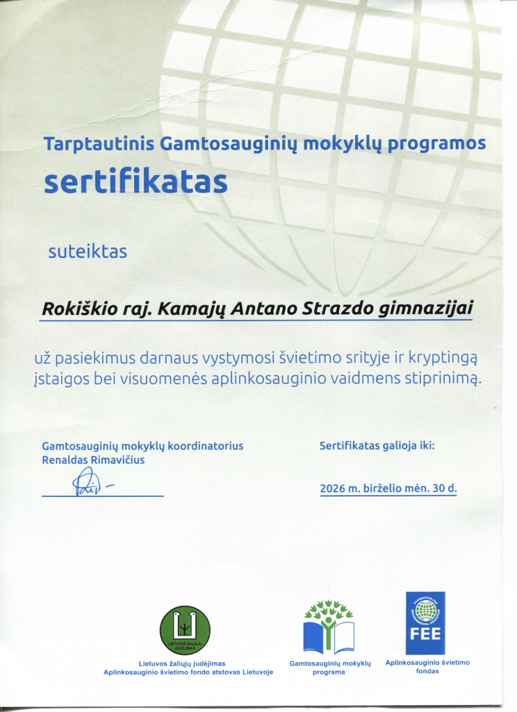 Už pasiekimus darnaus vystymosi švietimo srityje ir kryptingą įstaigos bei visuomenės aplinkosauginio vaidmens stiprinimą, Kamajų Antano Strazdo gimnazijai suteiktas Tarptautinis Gamtosauginių mokyklų programos sertifikatas.