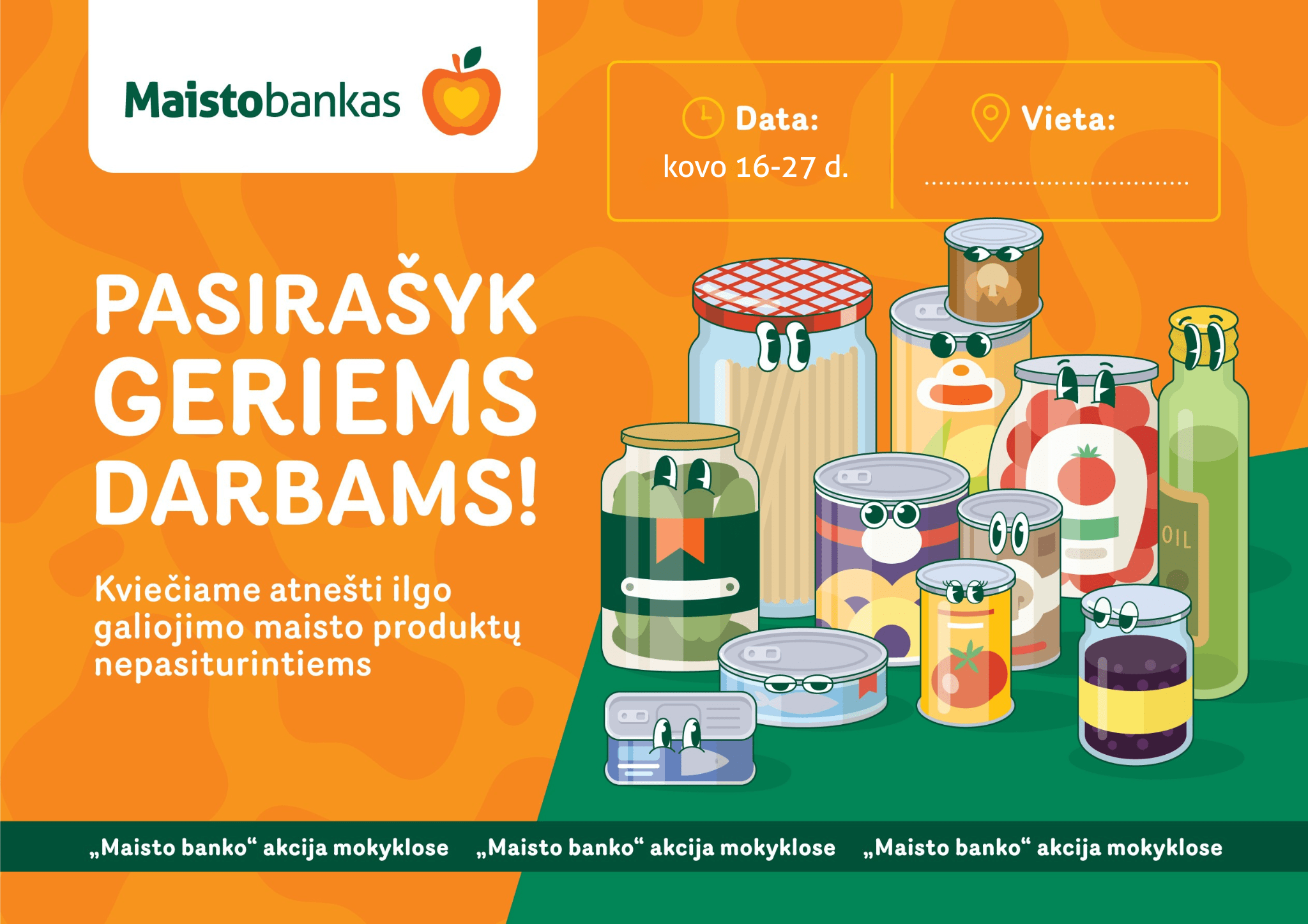 Lietuvos mokyklos bei darželiai ir šiais mokslo metais kviečiami jungtis prie „Maisto banko“ iniciatyvos „Pasirašyk geriems darbams“ ir padovanoti gerumą tiems, kuriems jo labiausiai reikia. Kovo 16–27 d. vyksiančios mokyklų akcijos metu kiekviena ugdymo įstaiga galės prisidėti rinkdama ilgo galiojimo maisto produktus savo bendruomenėje, o visi surinkti produktai pasieks stokojančius žmones visoje Lietuvoje.