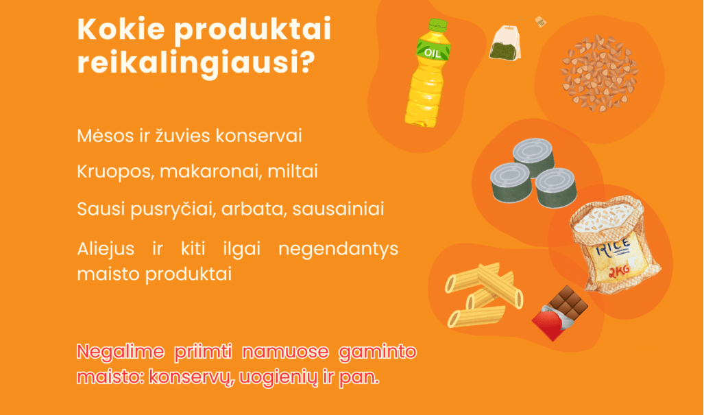 - Rekomenduojama rinkti: aliejų, kruopas, makaronus, konservus, miltus, arbatą, sausus pusryčius, konservuotas ar užpilamas sriubas ir kitus ilgo galiojimo produktus. Priimti namuose ruošto maisto organizacija negali.
