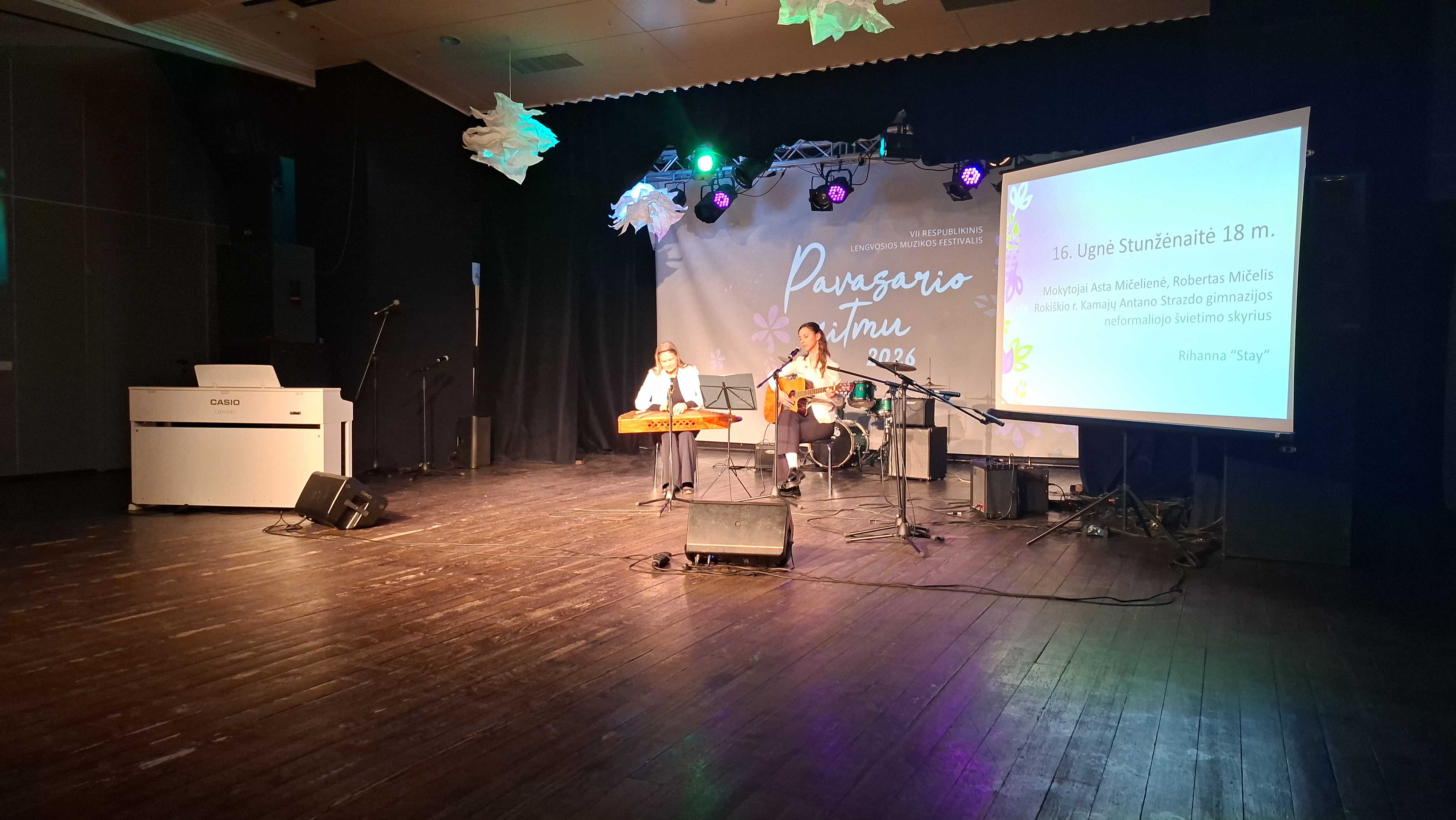 Š. m. balandžio 15 d. Rokiškio kultūros centre vyko VII respublikinis lengvosios muzikos festivalis ,,Pavasario ritmu 2026“. Mūsų gimnazijos NŠS gitaros ir kanklių studijų mokinių ansamblis: Ugnė Stunžėnaitė, Meda Braukylaitė, Akvilė Jakubonytė, Justė Vainickaitė, Neringa Papariga, Margarita Uokaitė atliko instrumentinį kūrinį, o Ugnė dar dainavo solo, pritardama gitara. Buvo smagu paklausyti kitų, po renginio pabendrauti. Ačiū organizatoriams – Rokiškio Rudolfo Lymano muzikos mokyklai už kvietimą dalyvauti, šiltas padėkas ir atminimo dovanėles.